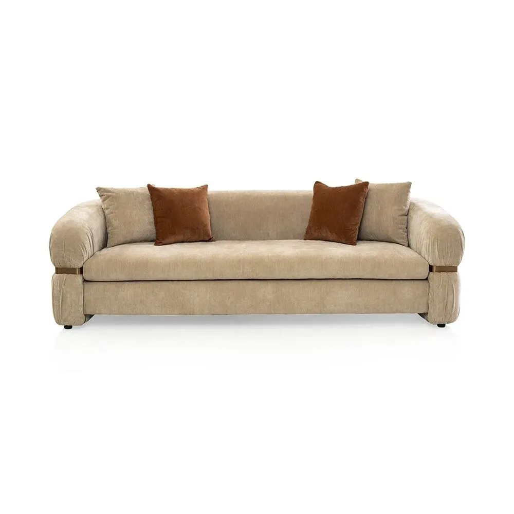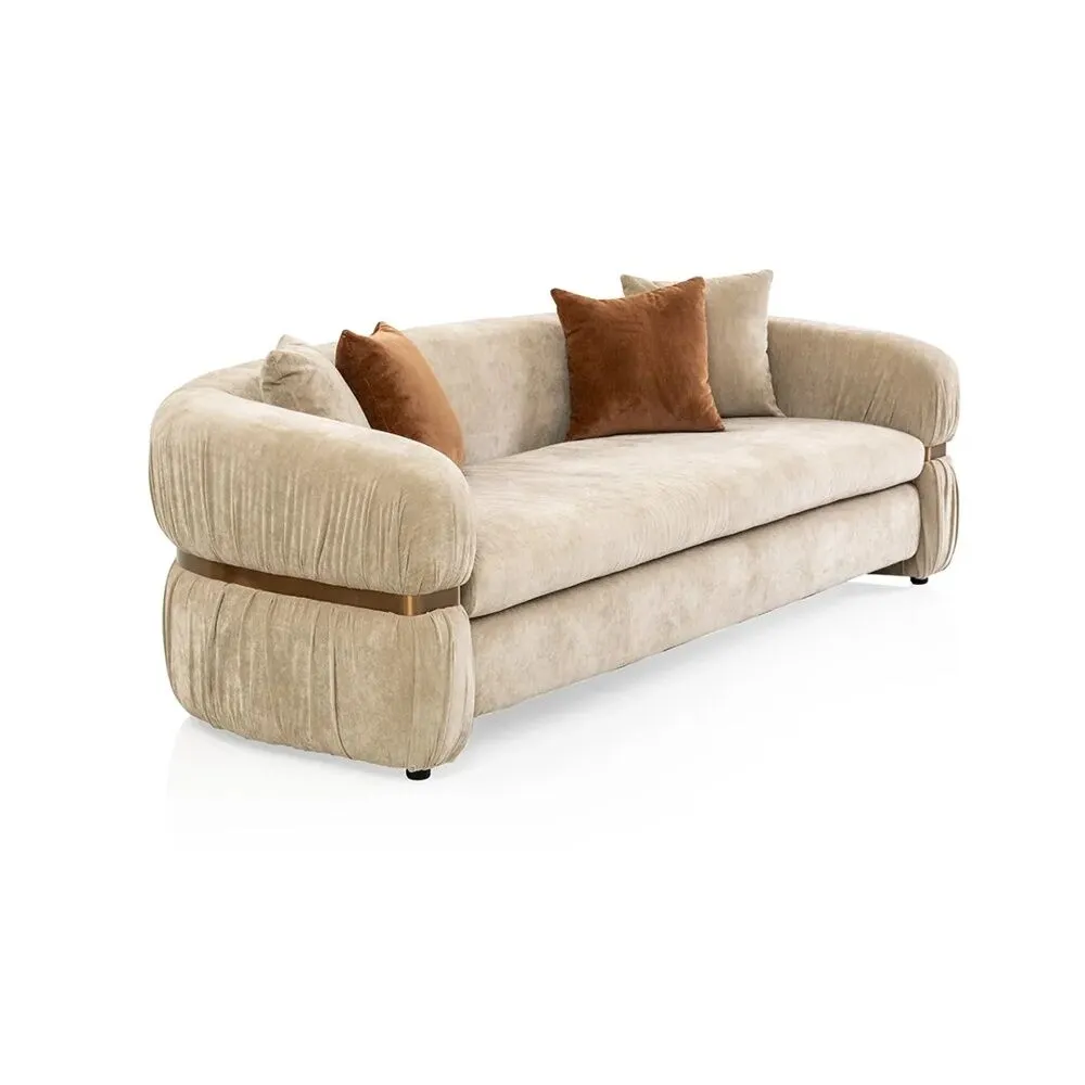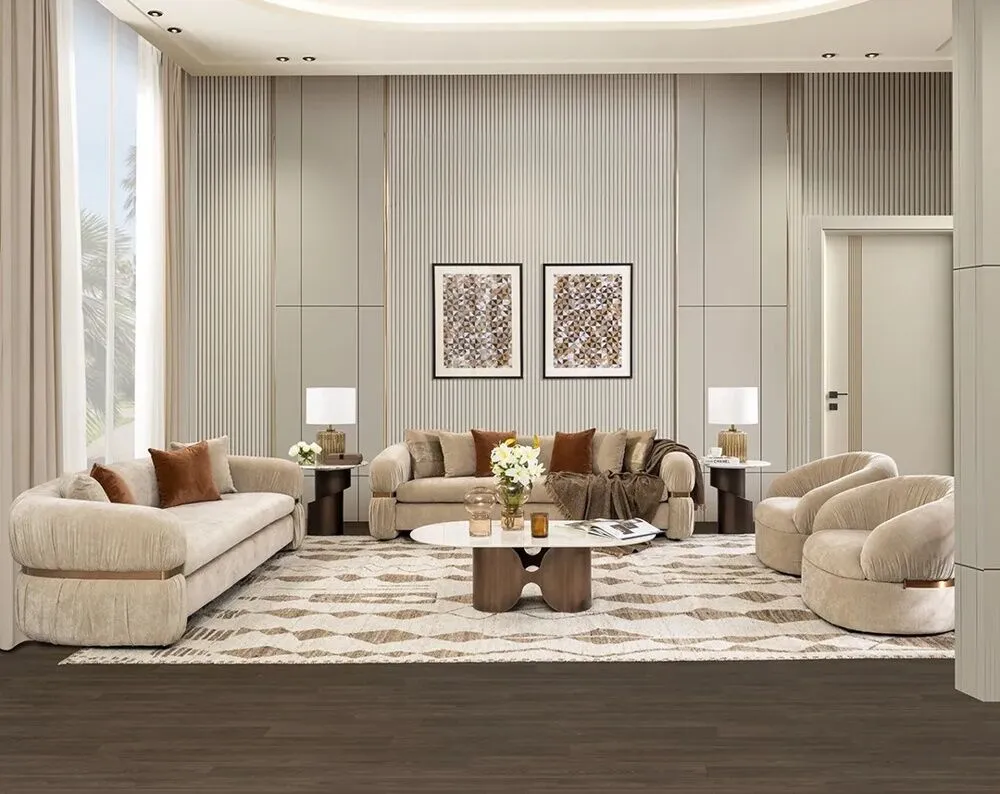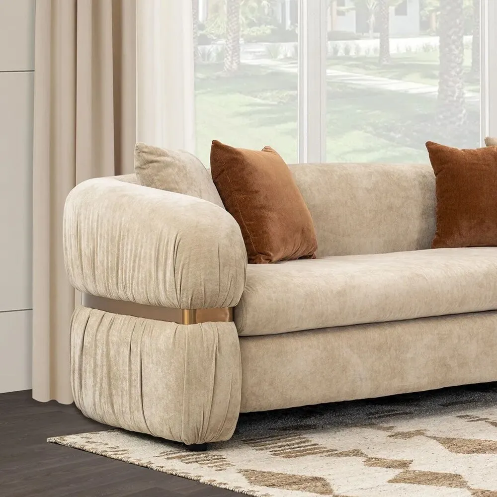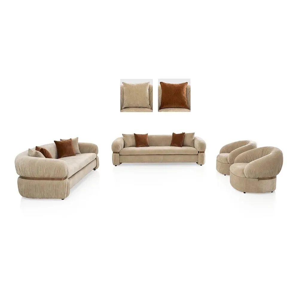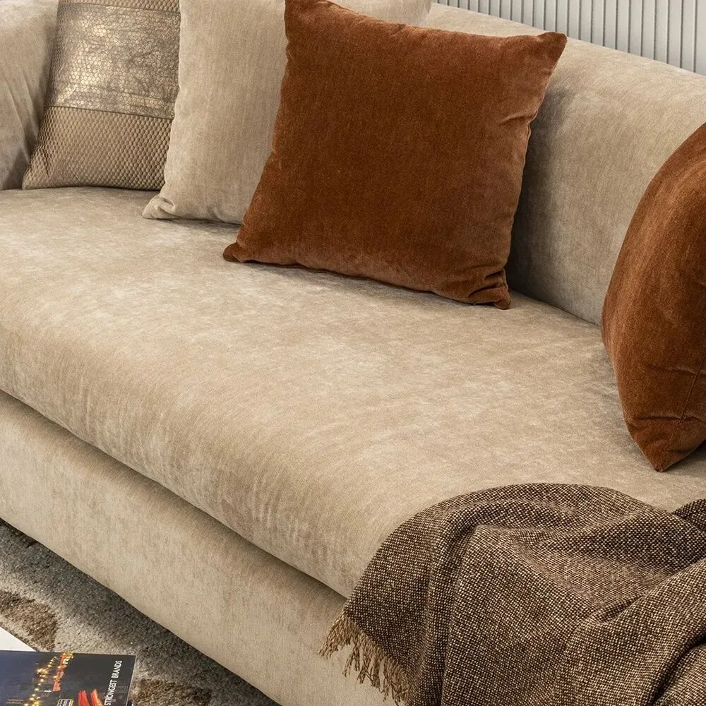 كنب انسيابي مع لون متوافق مع العديد من الألوان. لها مظهر أوروربي مع قوائم جذابة. تعطي الوسائد الاضافية المصنوعة من القماش الناعم الحيوية والجمال. تجمع بين التصميم الفريد والعملي بذات الوقت لتمنحك أعلى مستويات الراحة والاسترخاء لتضفي على اجتماعاتك وجلساتك لمسة من الدفء والعصرية.