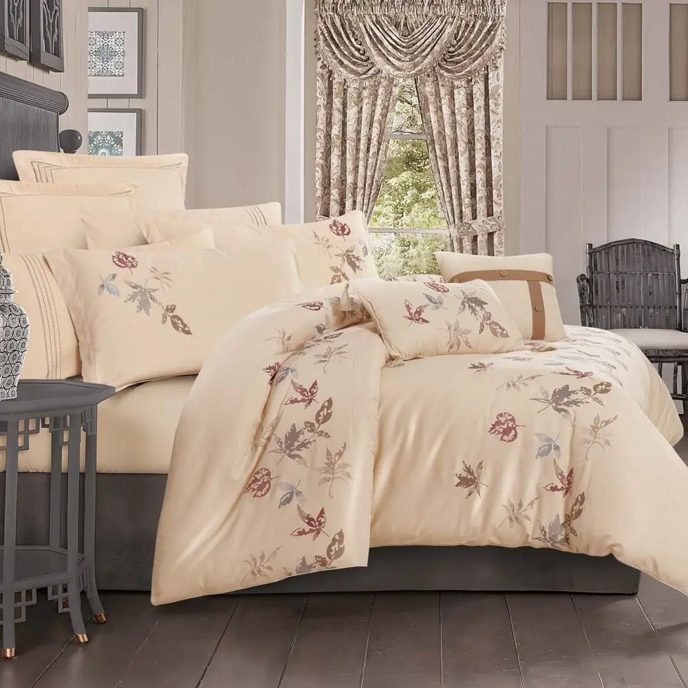 اللحاف : الطول : 270 - العرض : 250 سم شرشف مطاط :الطول :200 - العرض :200+40 سم 2 غطاء وسادة :الطول : 90 - العرض : 50 + 5 سم 2 غطاء وسادة : الطول : 90 - العرض : 50 سم 2 غطاء خداية طراز أوروبي . الطول : 60 - العرض : 60 + 5 سم 1 خدادية : الطول : 45 - العرض : 45 سم 1 خدادية ديكورية :الطول : 60 - العرض : 38 سم |