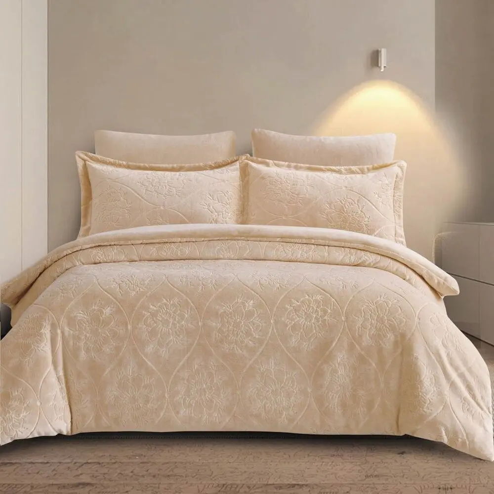 طقم لحاف بونيه شتوي مخمل محفور 200x150 سم 4 قطع - بيج