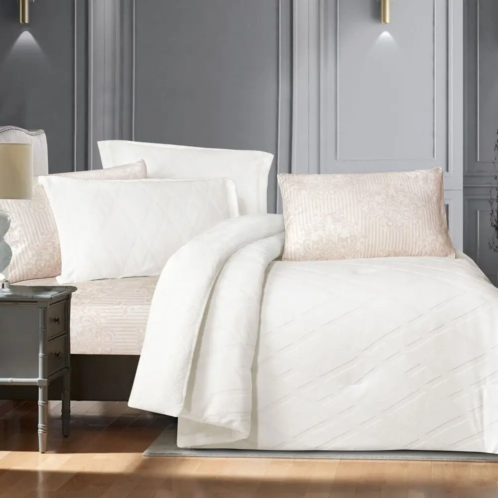 يتضمن الطقم 1 لحاف - 1 شرشف مطاط - 2 غطاء وسادة بحواف - 2 غطاء وسادة بدون حواف فقط .