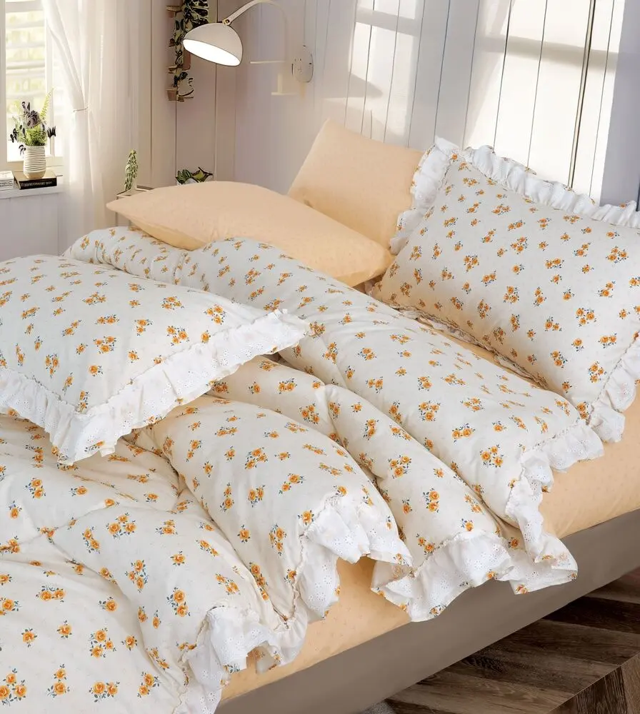 طقم لحاف كوين صيفي قطن ريد روز - 4 قطع - كريمي وأصفر