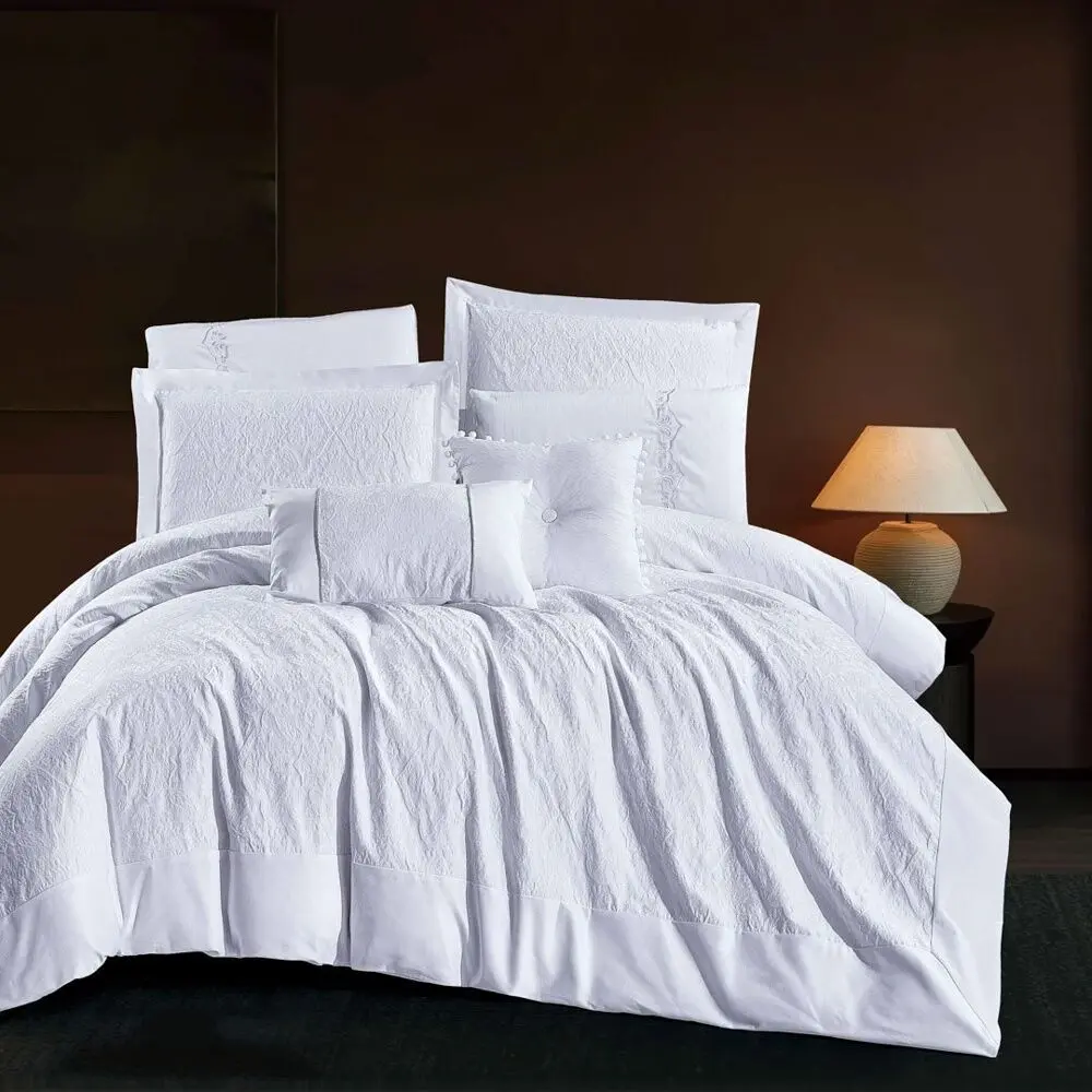 | يتضمن الطقم | 1 لحاف -1 شرشف مطاط - 2 غطاء وسادة بحواف - 2 غطاء وسادة بدون حواف - 1 خدادية - 1 وسادة ديكورية . |