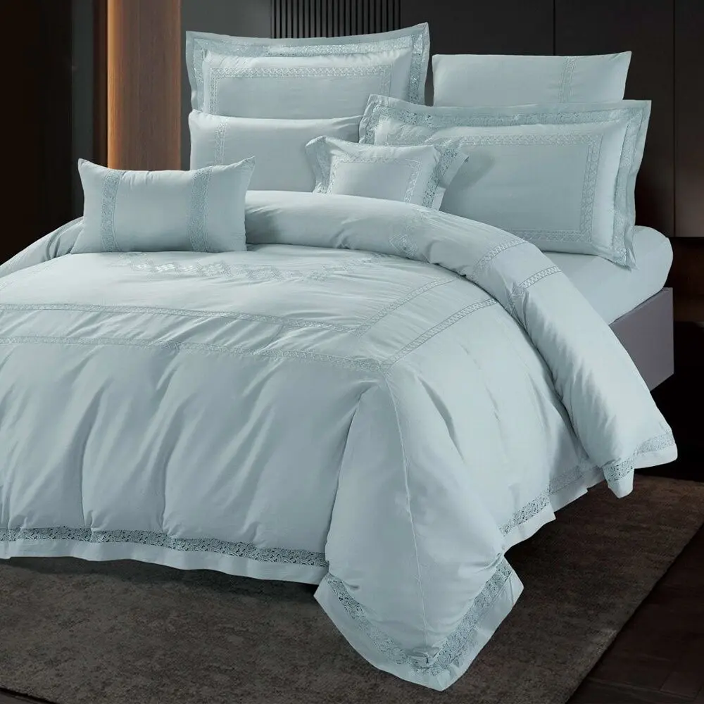 | يتضمن الطقم | 1 غطاء خارجي - 1 حشوة داخلية - 1 شرشف مطاط - 2 غطاء وسادة بحواف - 2 غطاء وسادة بدون حواف-2 خدادية - 1 علبة دبوس مثبت. |