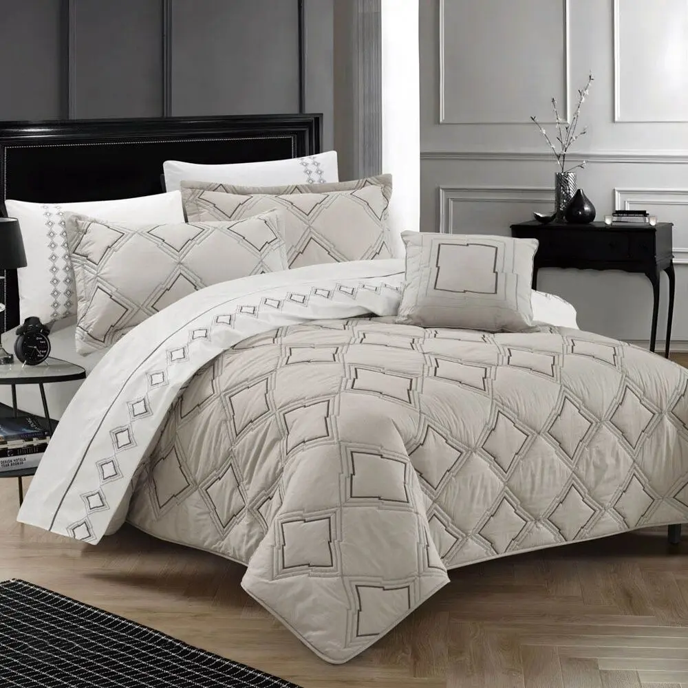| يتضمن الطقم | 1 لحاف -1 شرشف مسطح -1 شرشف مطاط - 2 غطاء وسادة بحواف - 2 غطاء وسادة بدون حواف - 1 خدادية . |