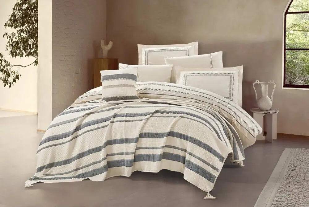| يتضمن الطقم | 1 لحاف 1 غطاء سرير 1 شرشف مطاط 2 غطاء وسادة 2 غطاء وسادة بحواف 1 خدادية فقط |