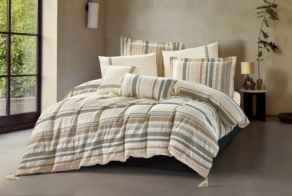 | يتضمن الطقم | 1 لحاف 1 شرشف مطاط 2 غطاء وسادة 2 غطاء وسادة بحواف 1 خدادية 1 خدادية ديكور فقط |