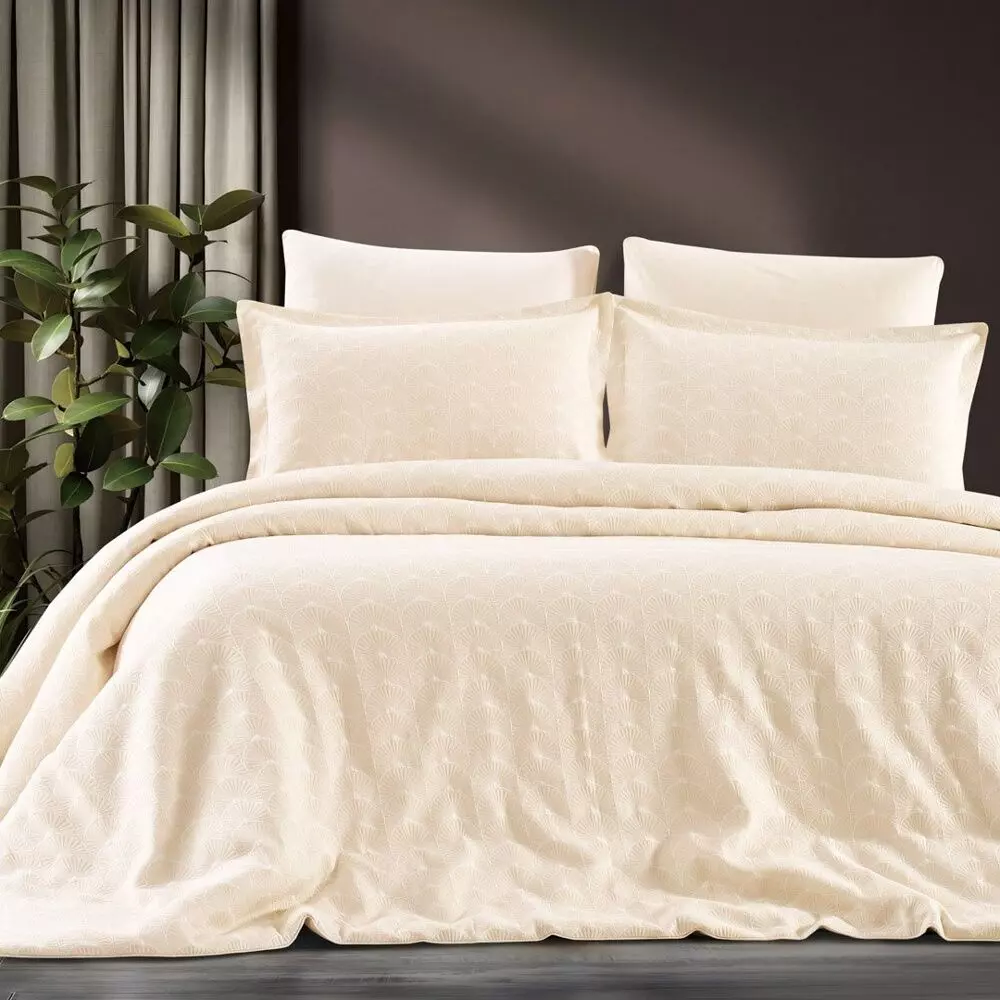 استمتع بتجربة نوم مثالية مع مايني لحاف صيفي مزدوج قطن جاكارد بيج فاتح 6 قطع – تصميم أنيق، وخامة قطنية فاخرة تمنحك راحة لا تُضاهى