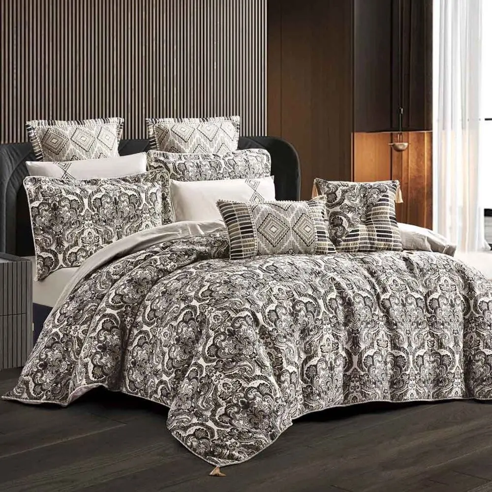 | يتضمن الطقم | 1 لحاف - 1 شرشف مطاط - 4 غطاء وساده - 2 غطاء وسادة دائرية - 1 وساده - 1 وسادة ديكور |