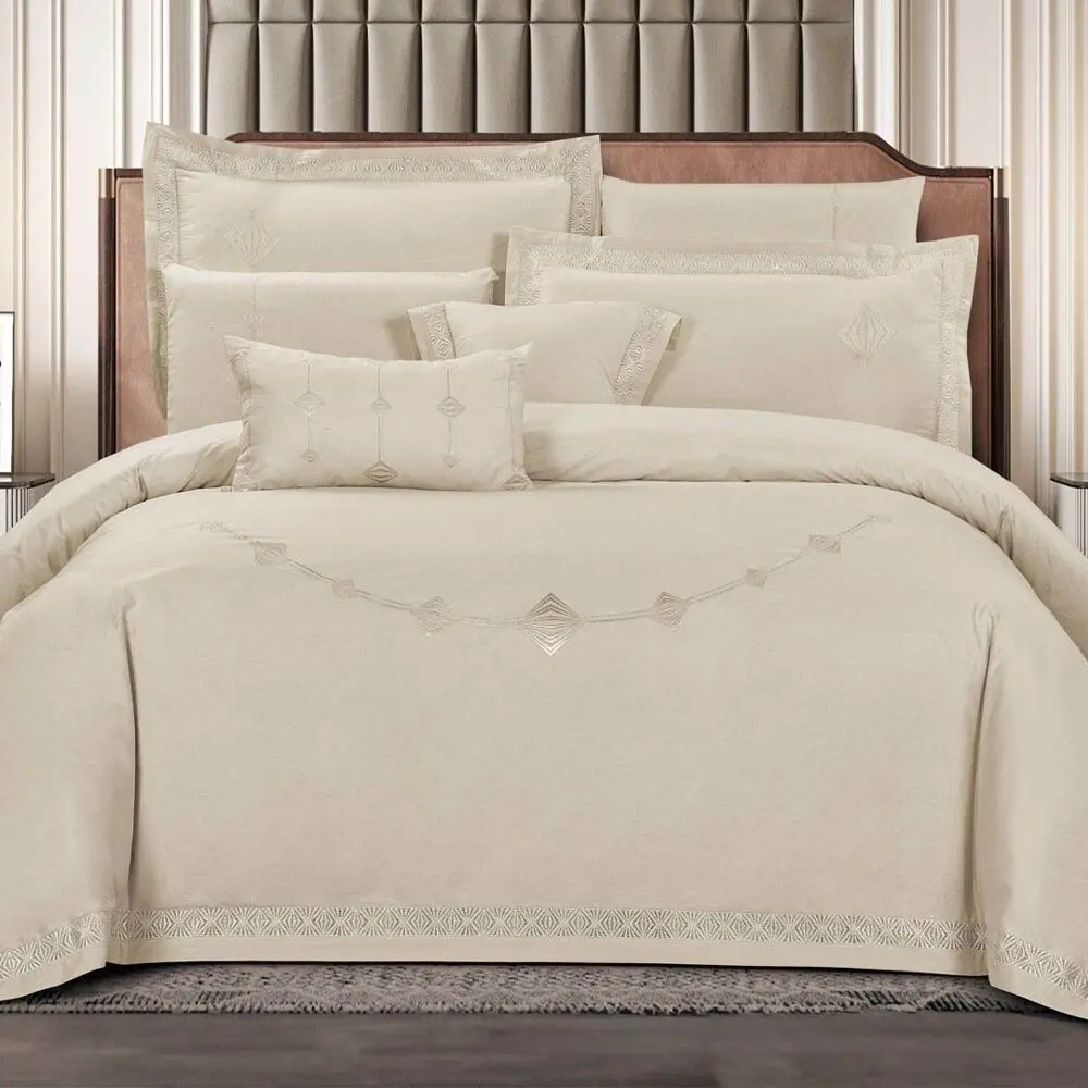القياسات : غطاء اللحاف : الطول : 270 سم العرض : 250 سم الحشوة الداخلية: الطول : 260 سم العرض: 240 سم شرشف مطاط الطول : 200 سم العرض : 200 + 40 سم 2 غطاء وسادة الطول : 50 سم العرض : 90 + 5 سم 2 غطاء وسادة الطول : 50 سم العرض : 90+5 سم 1 خدادية : الطول : 45 سم العرض : 45 سم 1 خدادية مطرزة الطول : 60 سم العرض : 35 سم |