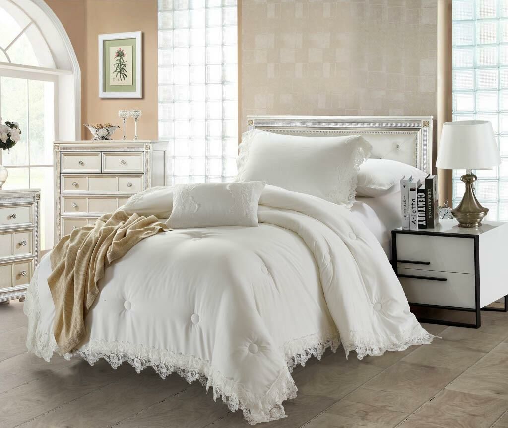 يتضمن الطقم لحاف - 1 قطعة ملاءة جاهزة - 1 غطاء وسادة بدون حواف - ا غطاء وسادة مع حواف - 1 غطاء وسادة ديكور - 1 وسادة ديكور