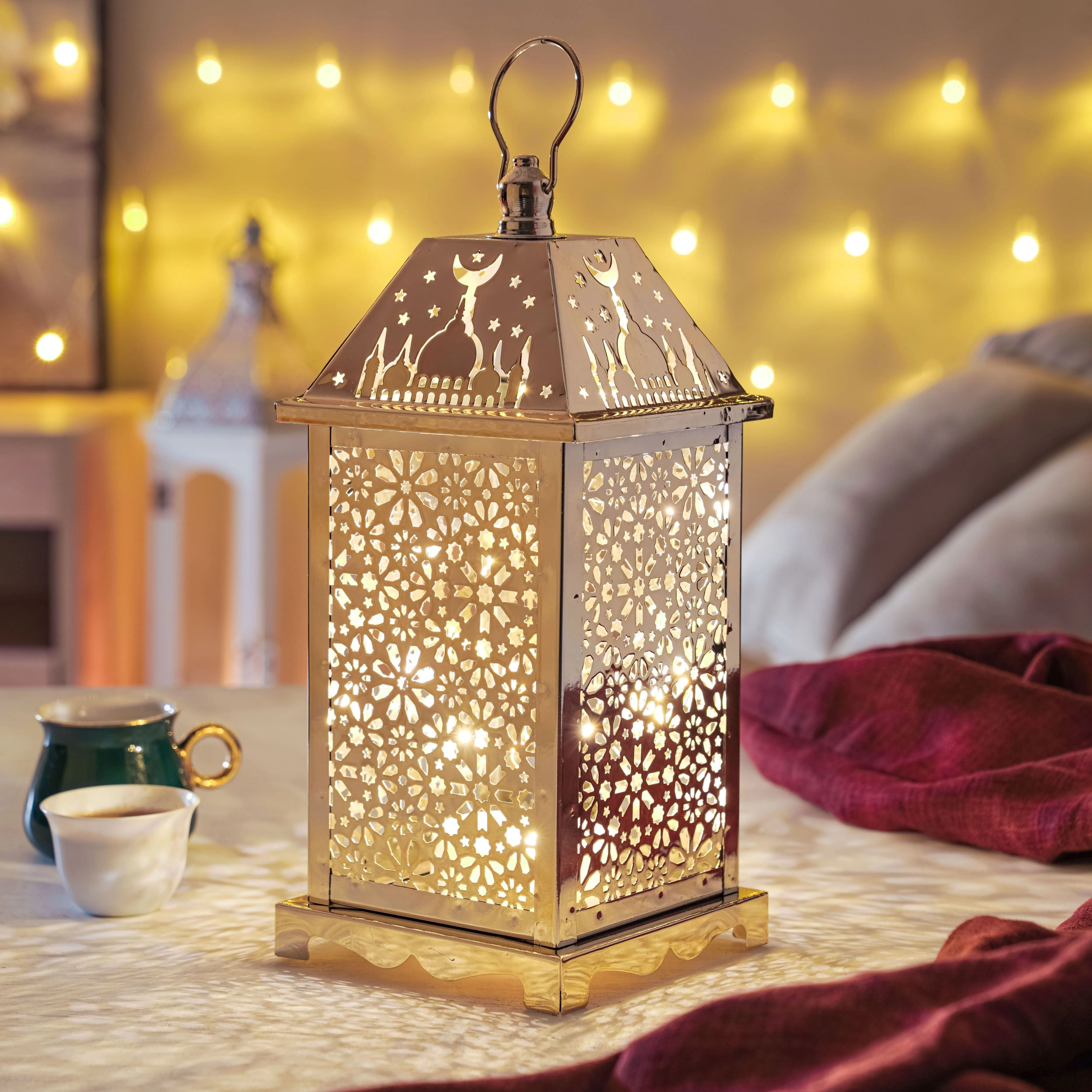فانوس رمضاني باضاءة وصوت، يعطي إضاءة جميلة في الليالي الرمضانية، يوفر هذا المصباح الكلاسيكي ضوءًا دافئًا وهو مثالي لخلق أجواء احتفالية للحفلات. مثالي للطاولة أو منضدة المطبخ أو رف الكتب. كما يوفر إضاءة محيطية لغرفتك ويبدو ساحرًا للغاية