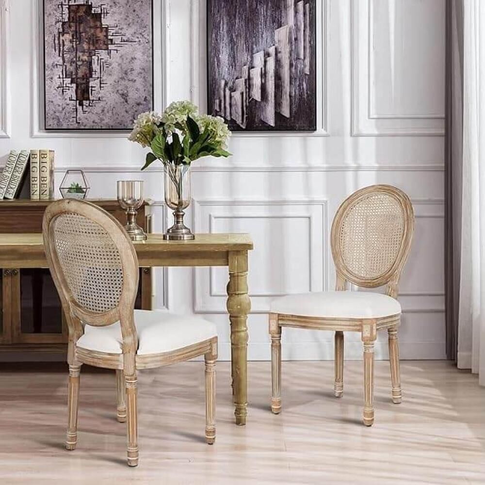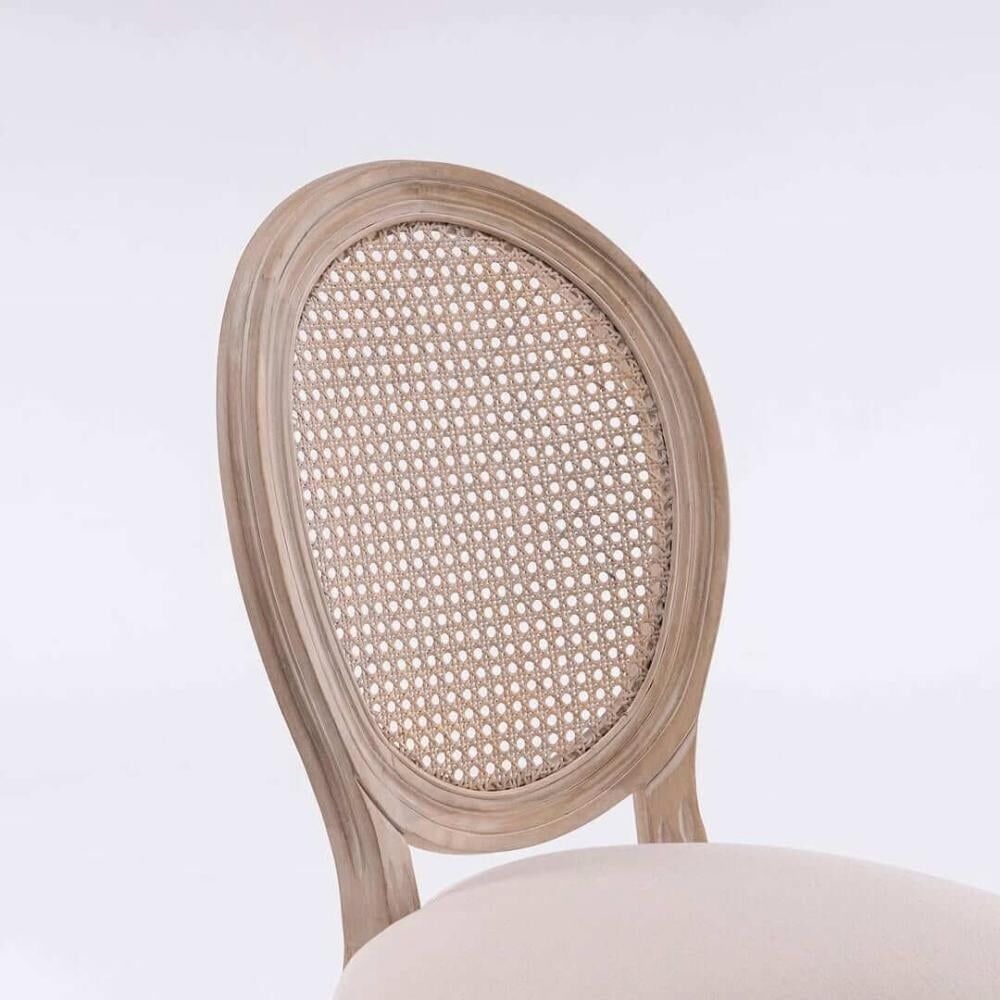 كراسي طعام منجدة على الطراز الفرنسي جانبية بدون ذراع مع مسند ظهر من الراتان وتنجيد بلمسة الكتان كريمي بحشوة من البوليستر