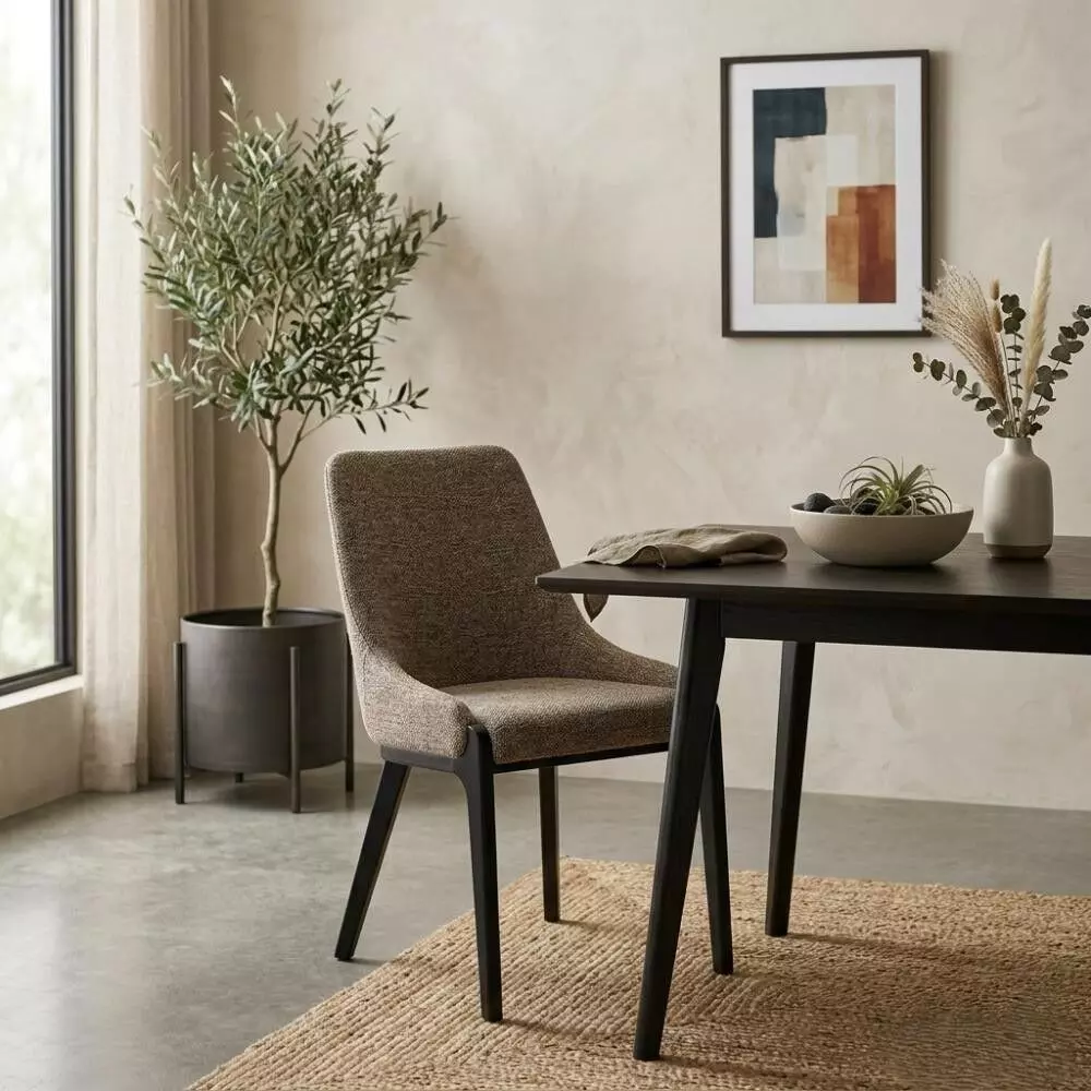 لون دافئ وتصميم راقٍ يمنح غرفة الطعام طابعًا مريحًا وأنيقًا. بتنجيد قماش مبطن يضمن لك جلسة مريحة وخامات عالية الجودة لضمان القوة والمتانة.