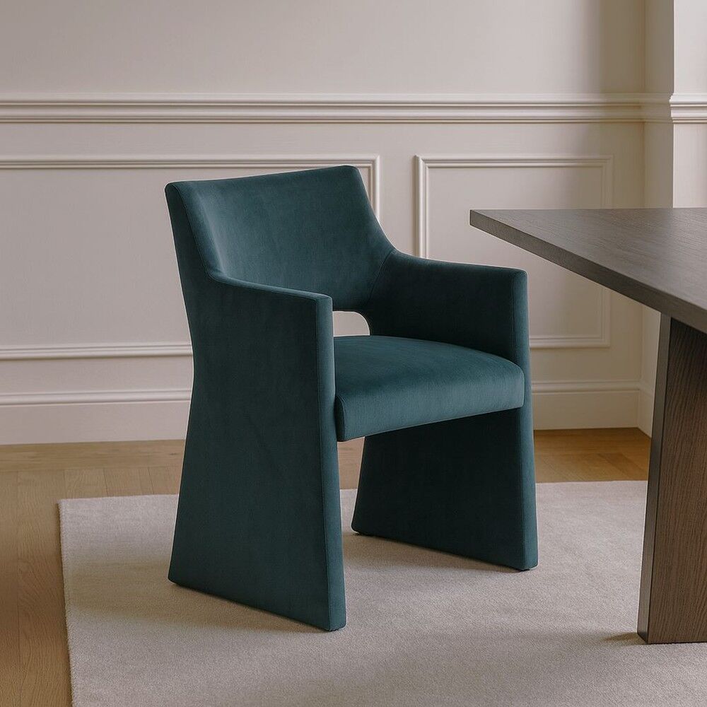 يأتي كرسي الطعام هذا بتصميم عصري بسيط يعتمد على شكل متماسك يمنحه مظهرًا أنيقًا وعمليًا في الوقت نفسه. يتم تنجيده بمخمل ناعم باللون الأخضر، ليضفي إحساسًا بالفخامة والدفء على مساحة الطعام. يتميز الكرسي بذراعين مدمجين ومقعد مريح، مما يوفر تجربة جلوس مستقرة وداعمة للاستخدام اليومي.