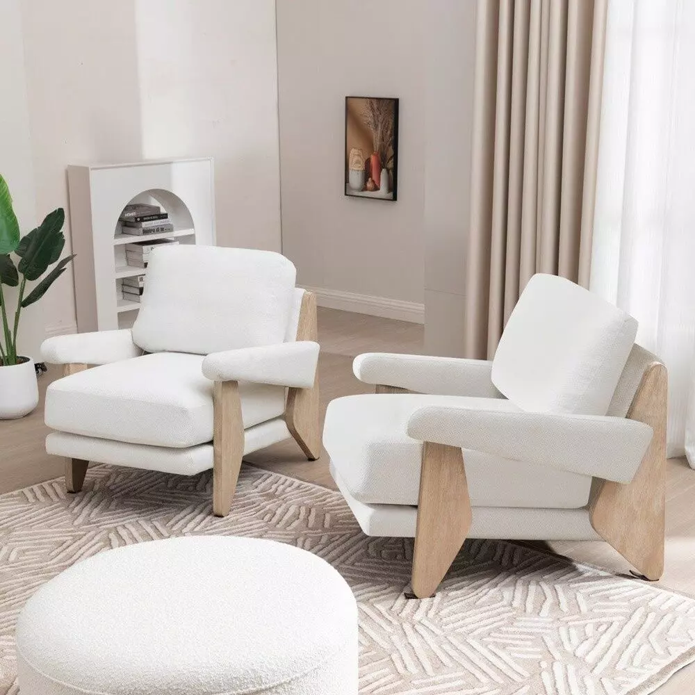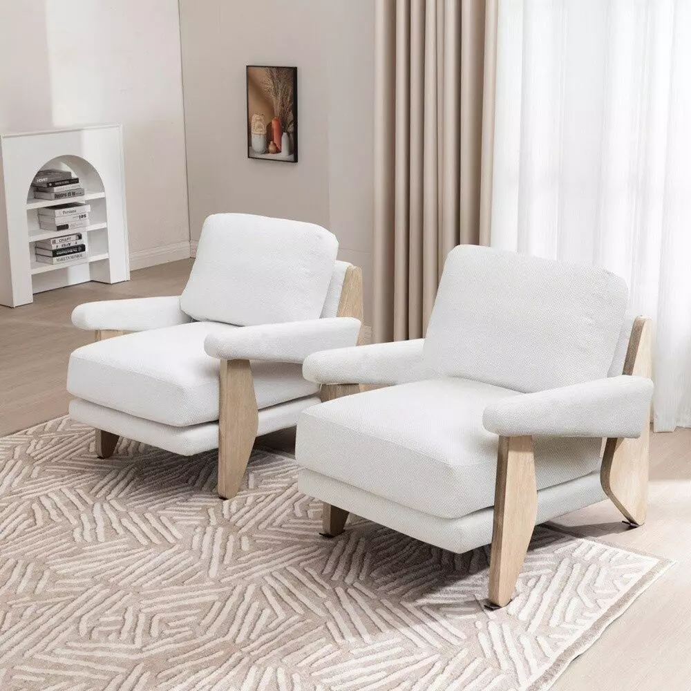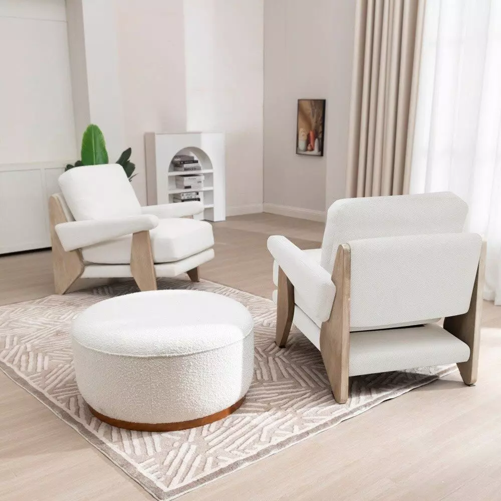 يُصبح هذا الكرسي المميز محورًا للمساحة بتصميمه الفريد وملمسه المريح. يأتي المقعد مزودًا بوسادة سميكة محشوة بإسفنج عالي الكثافة، مما يوفر دعمًا ونعومة ممتازين، مع صلابة ونعومة متوسطة، لذا لن تشعر بالتعب حتى مع الجلوس لفترة طويلة. تُكمل الوسادة السميكة جمال الوسادة، وسطحها مغطى بقماش الكتان الرقيق، مما يمنحه ملمسًا طبيعيًا وناعمًا، ويضيف لمسة ريفية. أما مسند الذراعين، فهو مصنوع من الخشب المصمت، بخطوط بسيطة وناعمة. السطح ناعم