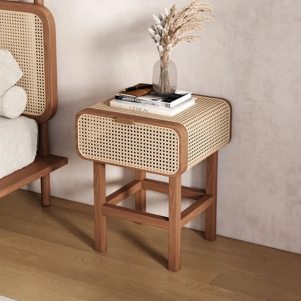 أضف لمسة من الأناقة الطبيعية والدافئة إلى غرفة نومك مع هذا الكومدينو الخشبي المصمم بعناية، والذي يجمع بين البساطة والفخامة. يتميز بتفاصيل مستوحاة من الطراز البوهيمي والسكندنافي، مع واجهات أدراج مصنوعة من خامة الراتان الطبيعي، مما يمنحه طابعًا عصريًا ومريحًا في آن واحد.