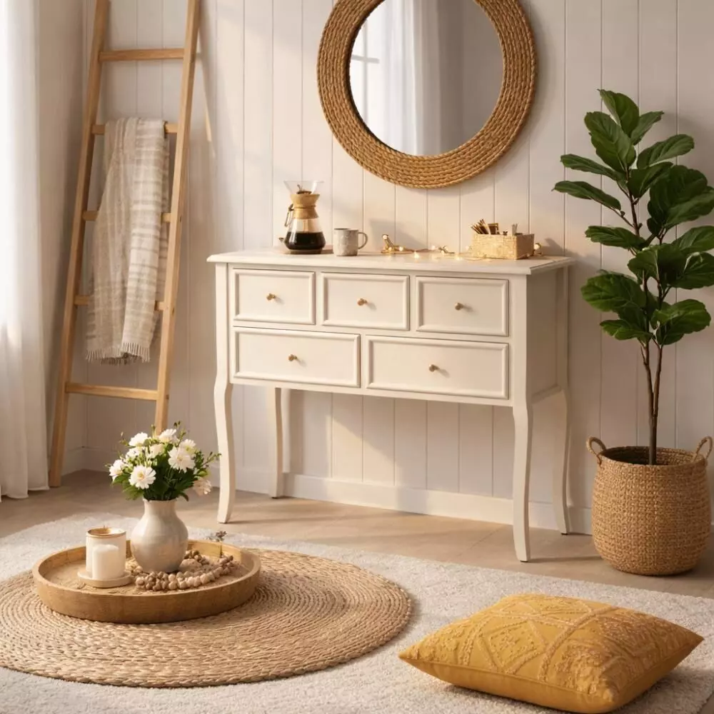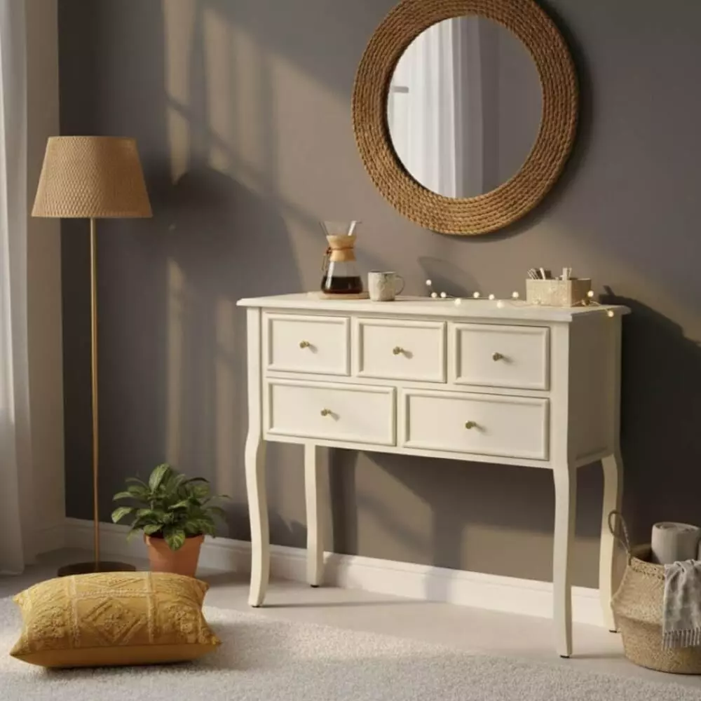 كونسول خشبي أنيق بلون لؤلؤي ناعم يضفي لمسة راقية ومضيئة على أي مساحة داخل المنزل، حيث يجمع بين التصميم الكلاسيكي الفاخر واللمسات العصرية الهادئة. يتميز بخطوطه الأنيقة وأرجل بتفاصيل منحوتة تضيف حضورًا جماليًا مميزًا، مع مساحة تخزين عملية تساعد على تنظيم الأغراض اليومية بطريقة مرتبة وأنيقة. يناسب المداخل وغرف المعيشة وغرف النوم، ويمكن تنسيقه بسهولة مع المرايا أو الإكسسوارات لإكمال ديكور متكامل يمنح المكان إحساسًا بالفخامة والدفء في آن واحد.
