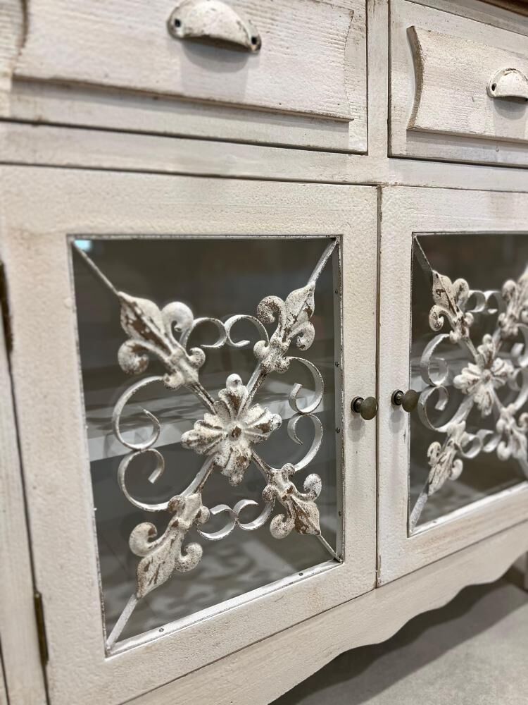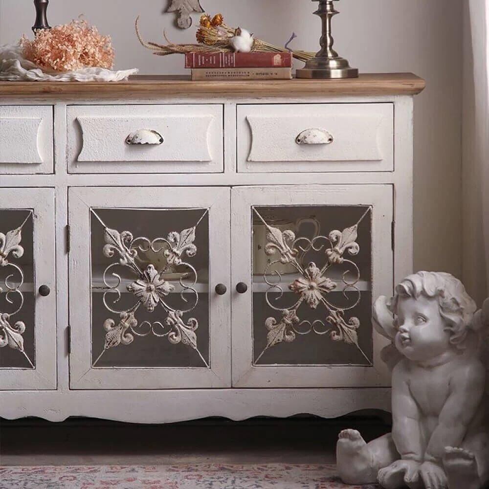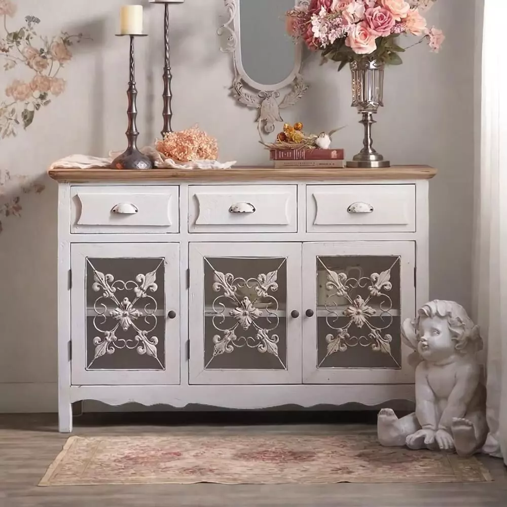 كونسول خشب طبيعي يدوي روميو يتميز بتصميم فاخر يجمع بين الطابع الريفي الفرنسي واللمسات الكلاسيكية الأنيقة، حيث صُنع من خشب طبيعي متين ومطعّم بالمعدن المشغول يدويًا مع تفاصيل من الزجاج المحفور بنقوش زهرية راقية تضفي عليه طابعًا فنيًا مميزًا، ويأتي بلون أبيض عتيق يمنح المكان إحساسًا دافئًا وجذابًا، كما يحتوي على ثلاثة أدراج وثلاثة أبواب مع رفوف واسعة توفر مساحة عملية للتخزين والتنظيم، مما يجعله خيارًا مثاليًا للمداخل أو غرف الطعام أو الزوايا الجانبية، ويتميز بسهولة التنظيف وجاهزيته للاستخدام دون الحاجة إلى تركيب، ليكون قطعة ديكور أنيقة تضيف لمسة فريدة لأي مساحة.
