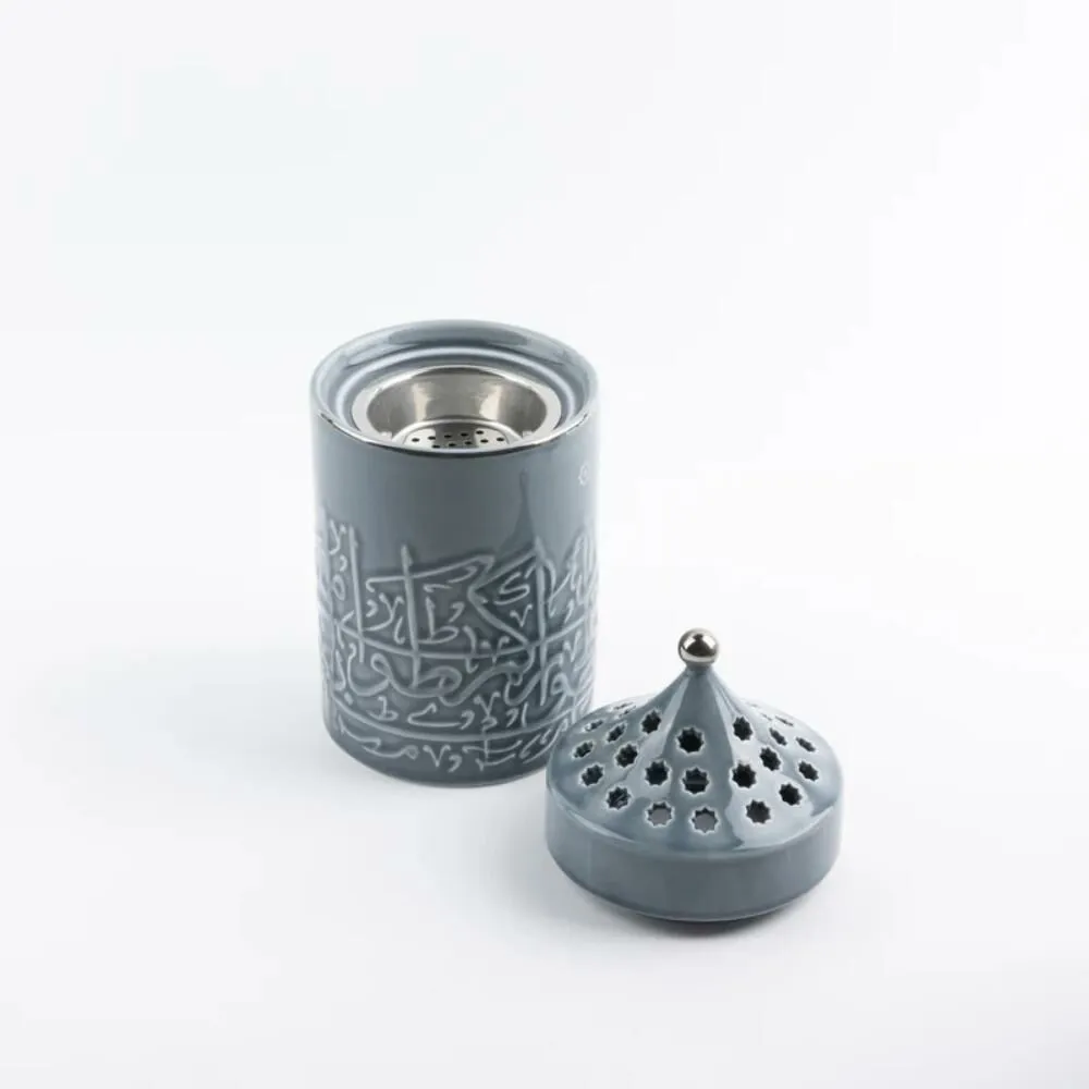 تصميم أنيق مصنوع من البورسلان، مزين بنقوش عربية دقيقة تضفي لمسة من التراث والجمال، يضم المنتج غطاء بفتحات متعددة تتيح خروج البخور بشكل متناسق، مع جسم المبخرة البورسلان ذات حجم مميز وسهل الحمل، تكتمل أناقة المبخرة بوعاء معدني صغير لوضع البخور بسلاسة.