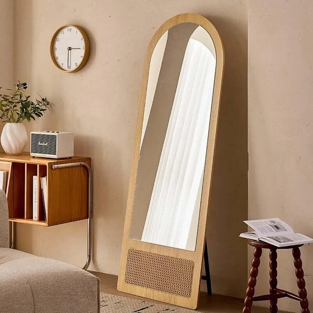 مرآة أرضية طويلة بإطار خشب وراتان - تصميم أنيق وعصري أضف لمسة من الأناقة الطبيعية إلى ديكور منزلك مع هذه المرآة الأرضية الطويلة المصنوعة من الخشب والرّاتان الطبيعي. تصميمها المنحني العلوي يمنحها طابعاً هادئاً وراقياً، مع قاعدة من الراتان المفرغ تضيف لمسة فنية فريدة. تأتي مزودة بإستاند حديدي خلفي بلون أسود يمنحها ثباتًا ممتازًا وسهولة في النقل والترتيب.