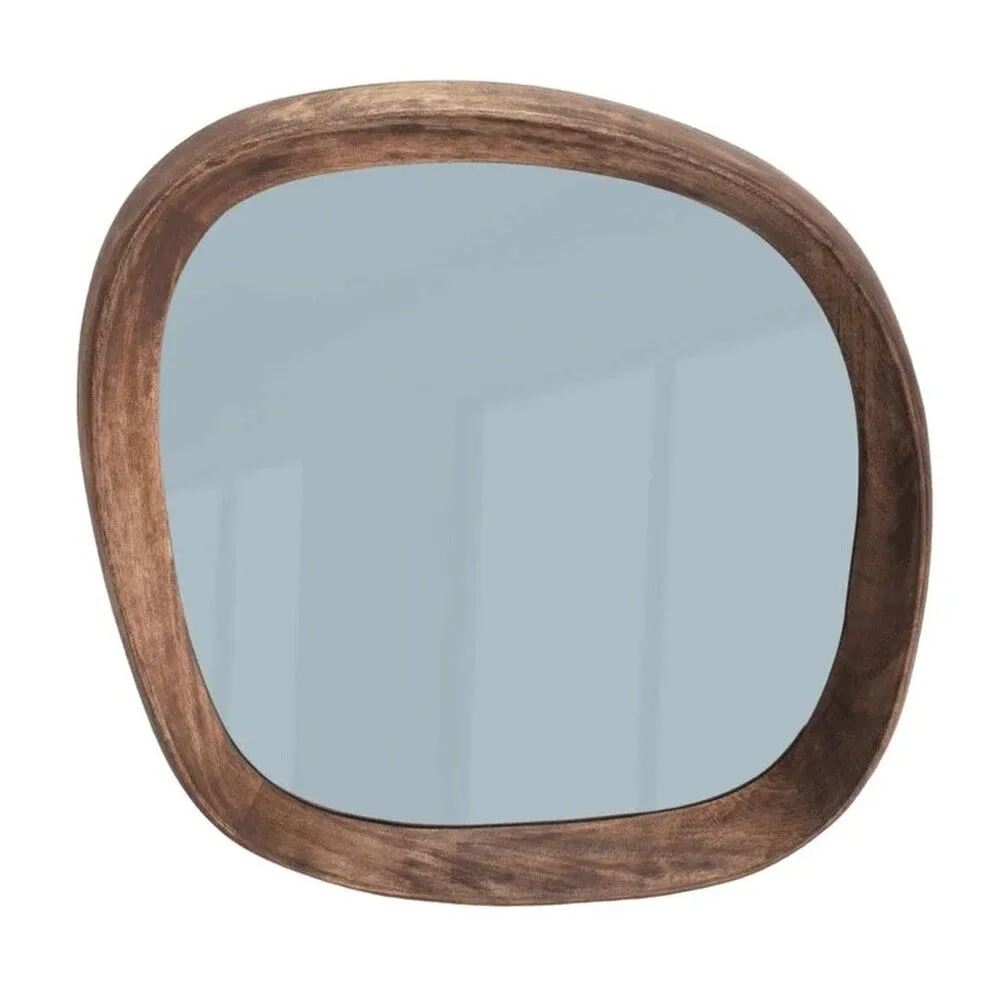 المرآة الجدارية تتميز بإطار خشبي مميز بتصميم عصري غير منتظم يضيف لمسة من الأناقة على المكان. حواف الإطار ناعمة ومنحنية، مما يخلق مظهرًا مريحًا وطبيعيًا. هذا التصميم الفريد يجعل المرآة قطعة فنية تبرز في أي مساحة.