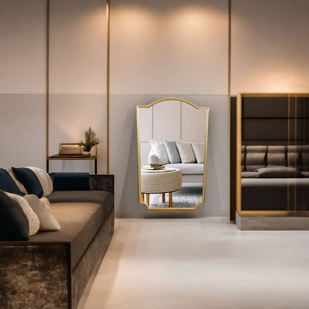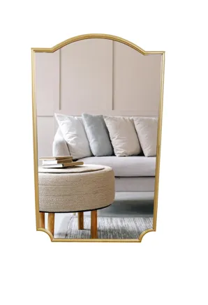 • مرآة حائط مستطيلة بإطار حديد لون ذهبي مع تفاصيل مميزة تجمع بين التصميم العصري والجودة العالية لإضفاء لمسة أنيقة على المساحة المعيشية في منزلك.