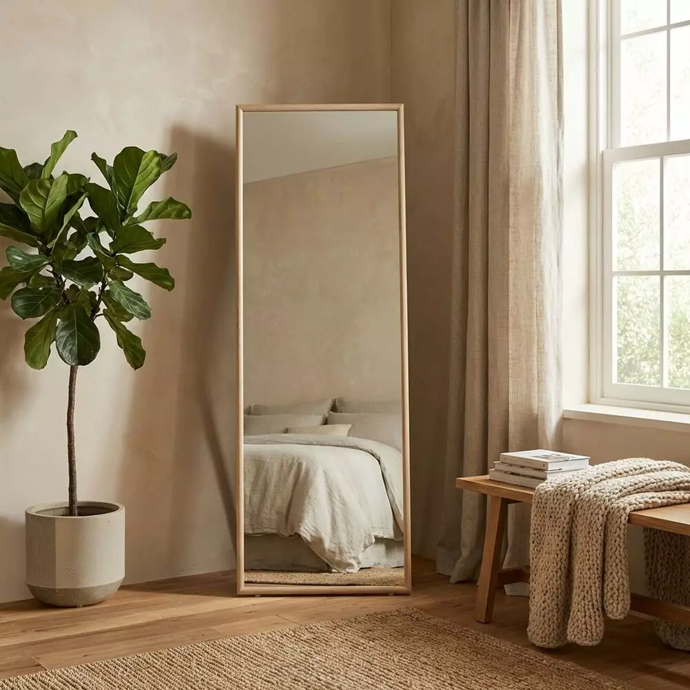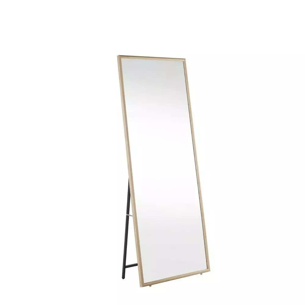 مرآة ستاند إطار خشب سولا لون بيج بتصميم عصري وعملي، تمنحك إطلالة كاملة وواضحة من الرأس حتى القدم.