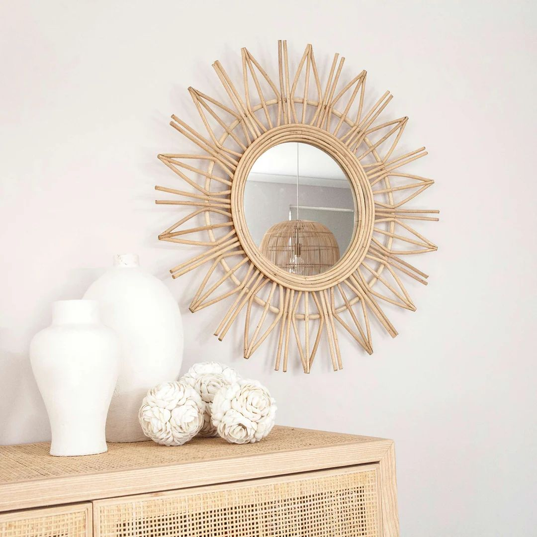 مرآة دائرية بإيطار من خشب الراتان ذو الجودة العالية تم تصميمها بشكل حديث و معاصر و بألوان تتناسب مع جميع الأذواق