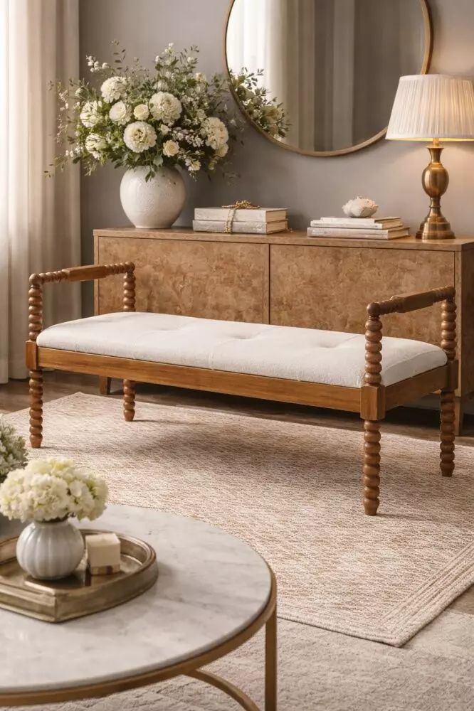 مقعد بنش سافرين هو قطعة أثاث فاخرة بتصميم كلاسيكي أنيق يجمع بين الفخامة والعملية، مصنوع من خشب طبيعي عالي الجودة مع نقوش محفورة بدقة تعكس طابعًا راقيًا وحِرفية مميزة. يتميز بمقعد مريح مبطن بقماش ناعم بلون هادئ ينسجم بسهولة مع مختلف أنماط الديكور، مما يجعله إضافة مثالية لإضفاء حضور دافئ وفخم على مدخل المنزل أو المساحات الداخلية الراقية. يوفر استخدامًا عمليًا للجلوس مع قيمة جمالية عالية، ويمكن تنسيقه بسهولة مع المرايا والسجاد والإكسسوارات لإكمال مظهر أنيق ومتوازن يضفي لمسة فخامة ودفء على أي زاوية داخل المنزل.
