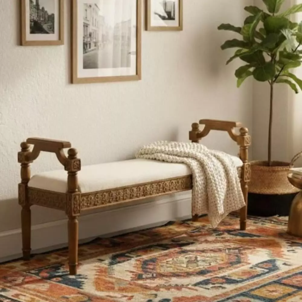 مقعد بنش سوليرا هو قطعة أثاث فاخرة تجمع بين الطابع الكلاسيكي الأنيق والحِرفية الدقيقة، مصنوع من خشب طبيعي عالي الجودة مع نقوش محفورة بتفاصيل متقنة تعكس ذوقًا راقيًا ولمسة فنية مميزة. يتميز بمقعد مريح مبطن بقماش ناعم بلون هادئ ينسجم بسهولة مع مختلف أنماط الديكور، مما يجعله إضافة مثالية لمدخل المنزل أو المساحات الداخلية الراقية. يجمع هذا البنش بين العملية والجمال، حيث يوفر استخدامًا مريحًا للجلوس مع حضور ديكوري قوي يضفي دفئًا وفخامة على المكان، ويمكن تنسيقه بسهولة مع المرايا أو السجاد أو الإكسسوارات لإكمال مظهر أنيق ومتوازن في أي مساحة.