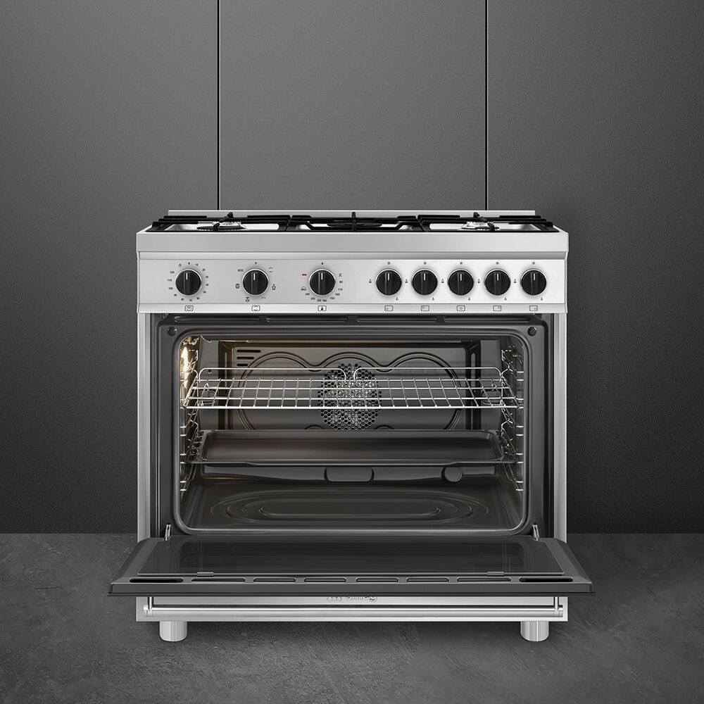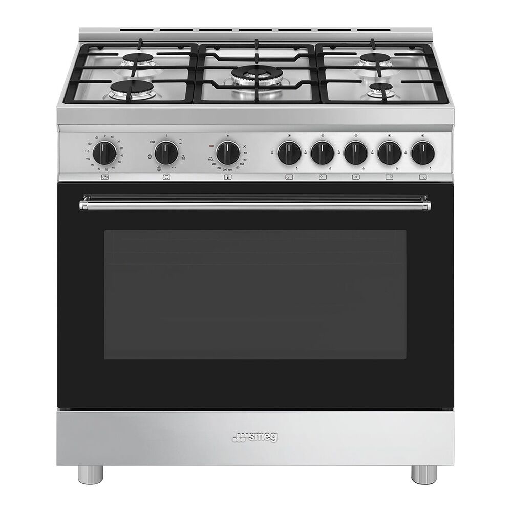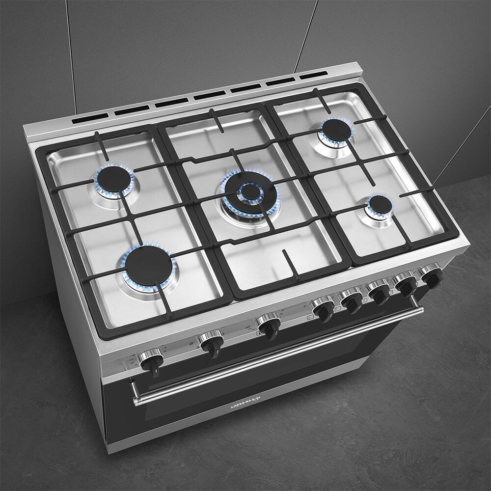 موقد سميج 90 سم فري ستاند كهربائي مع 5 شعلات غاز وخاصية التنظيف بالبخار - ستانلس ستيل