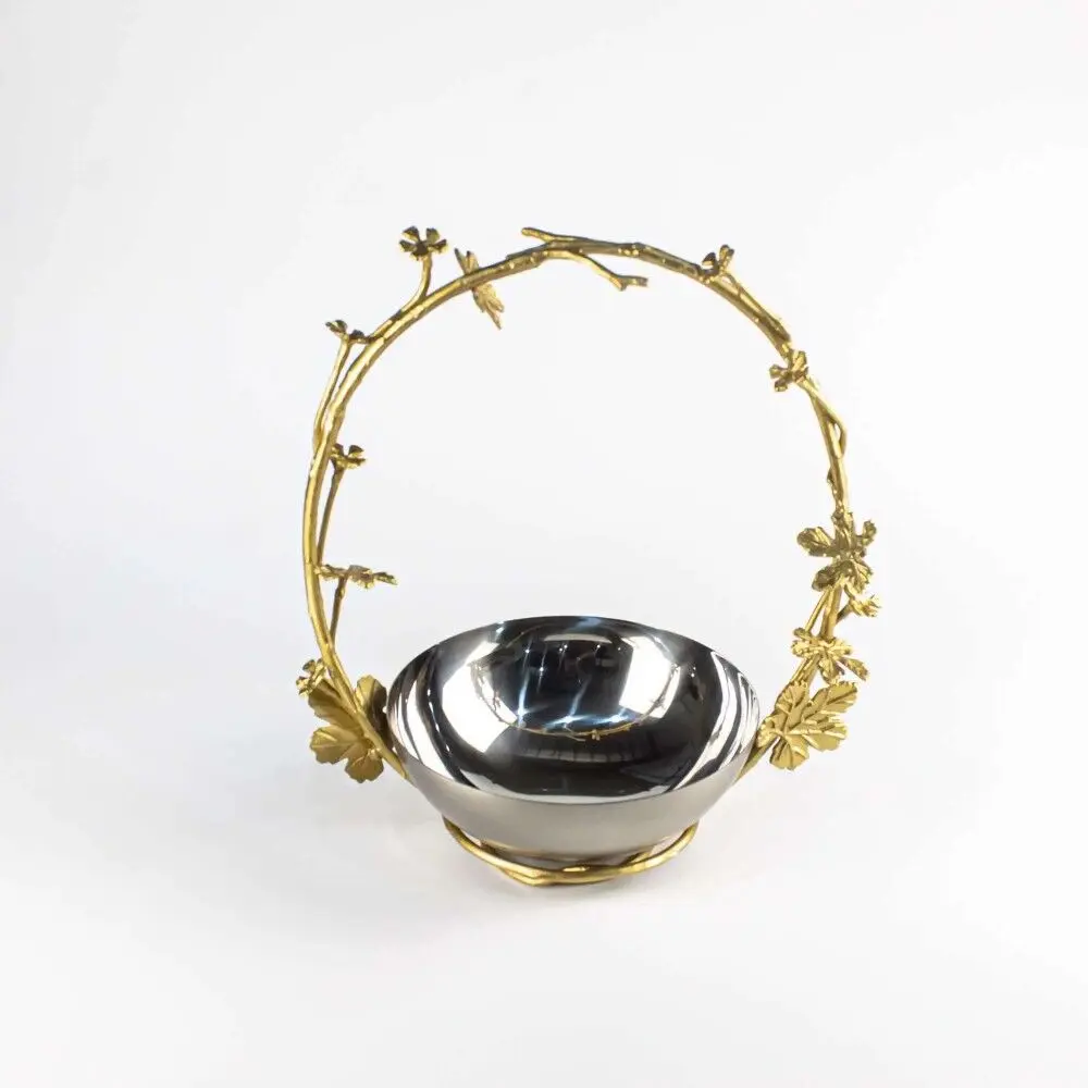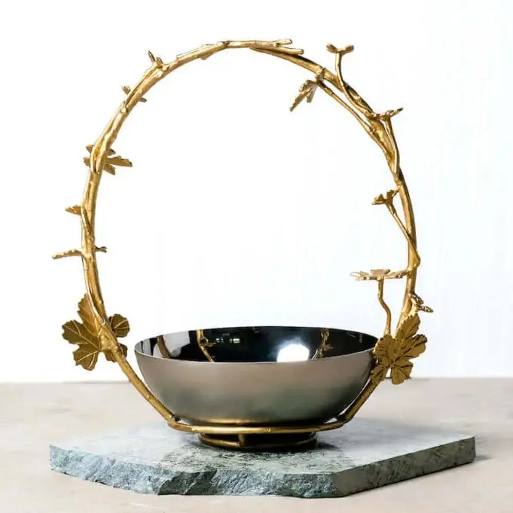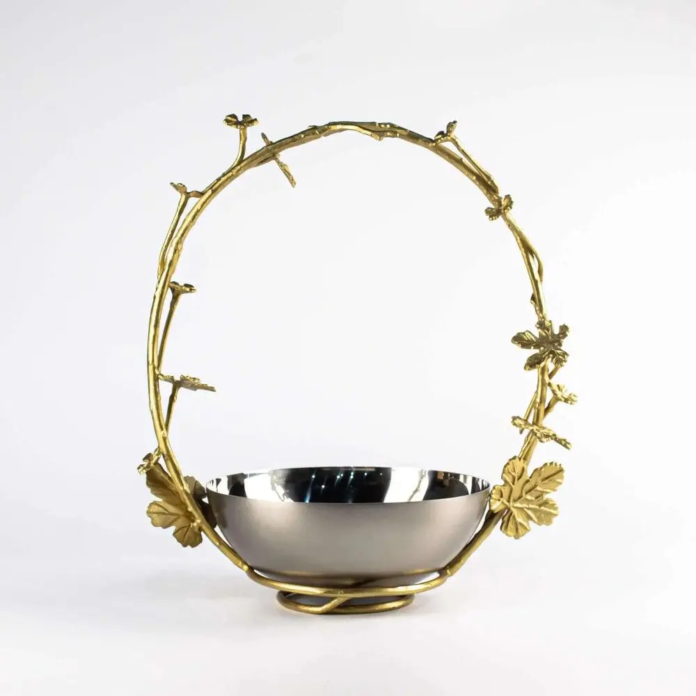 وعاء تقديم بتصميم مستوحى من أوراق العنب، تجمع بين النحاس والفولاذ المقاوم للصدأ لتوفر متانة عالية ولمسة جمالية راقية. تتميز بتشطيب أنيق بألوان النحاس المطفي والفضي اللامع والفضي المطفي، ما يمنحها طابعًا عصريًا وفخمًا في آنٍ واحد. تصميمها الفني يجعلها مثالية للتقديم أو كقطعة ديكور مميزة تضيف لمسة طبيعية وأنيقة إلى المائدة أو أي مساحة داخلية.