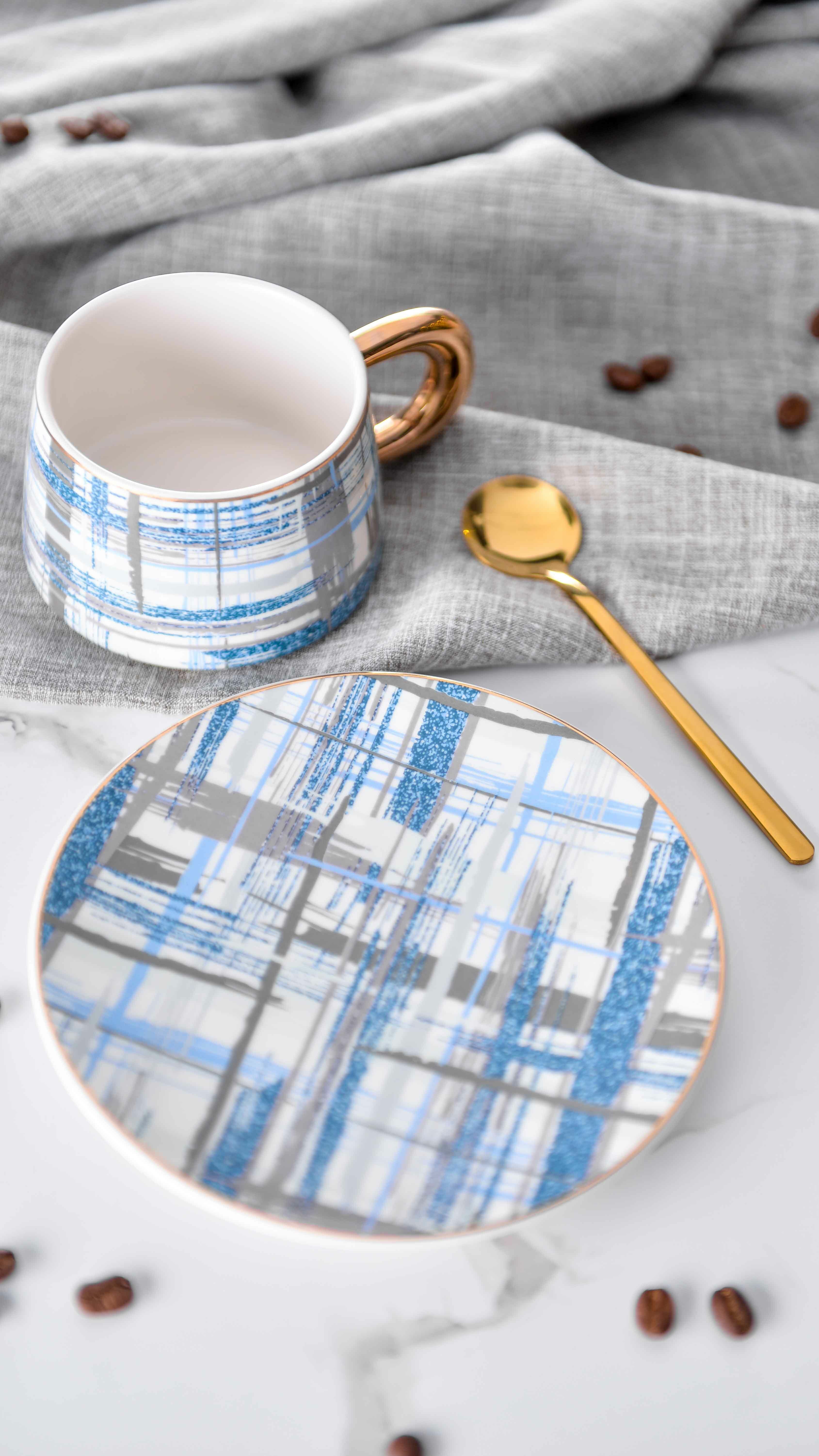 للكوب صحن حامل له يشكل حماية لسطوح الطاولات ومزود بمقبض ليقيك من سخونة المشروبات كما يتضمن ملعقة لتحريك السكر جذابة.