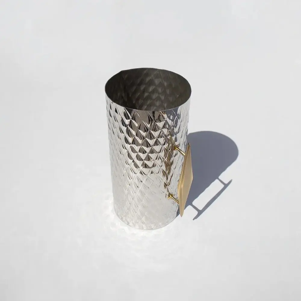 إبريق أنيق مصنوع من الستانلس ستيل، يتميز بتصميم عصري أنيق مع نقش ماسي مزدوج عمودي ومقبض ذهبي مريح. أضف لمسة ملكية عتيقة إلى مطبخك وغرفة طعامك باستخدام هذا الإبريق كأداة للشرب والتقديم.