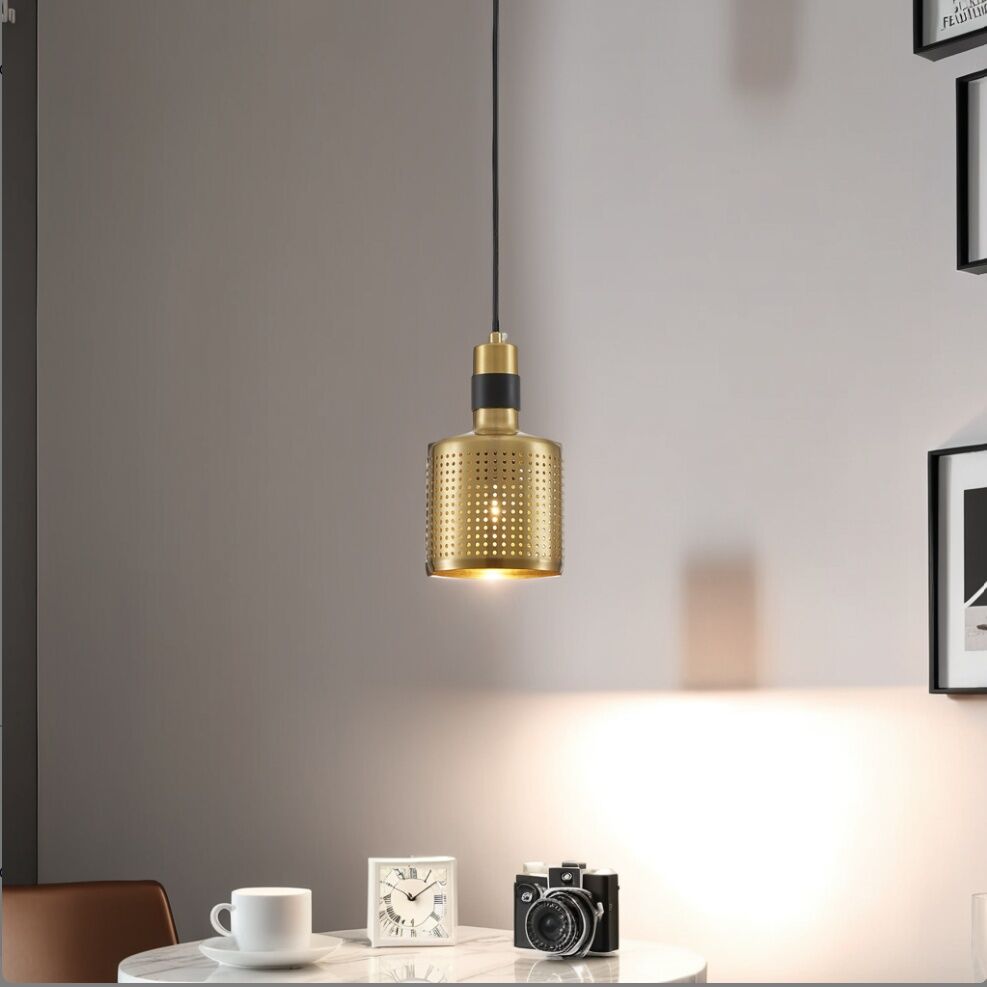 انارة معلقة تجمع بين الأناقة والحداثة، حيث يتميز بجسم معدني مطلي بالنحاس مع تصميم مثقب يسمح بتوزيع الإضاءة بطريقة ناعمة وجذابة. يتمتع بتصميم عصري مناسب لديكورات المنازل والمطاعم الفاخرة. يعمل المصباح مع لمبات E27 (غير مرفقة) ويدعم لمبات بقدرة قصوى تصل إلى 40 واط. مصنف بمعيار IP20 للاستخدام الداخلي فقط، مما يجعله مثاليًا لغرف المعيشة، غرف الطعام، وغرف النوم.
