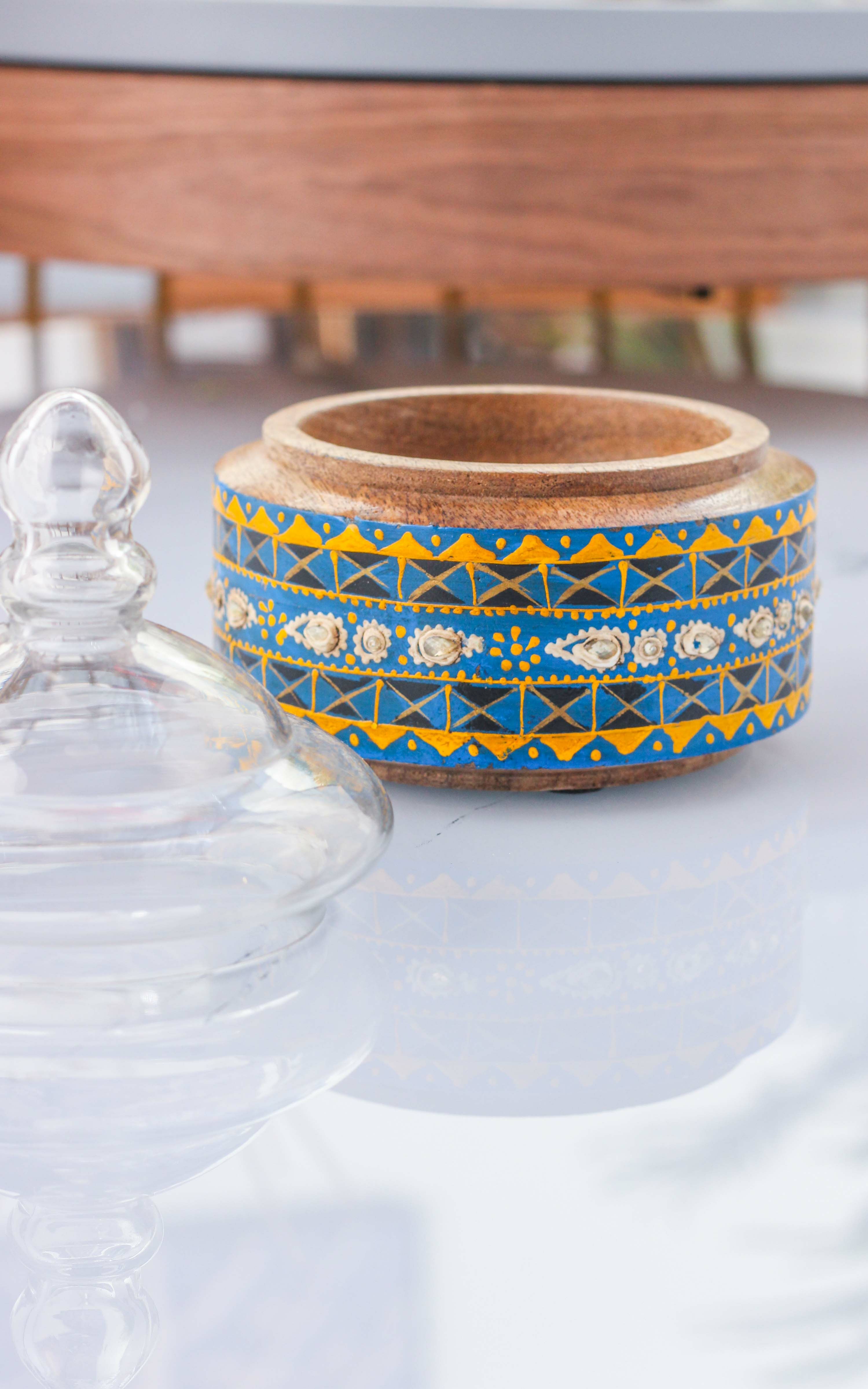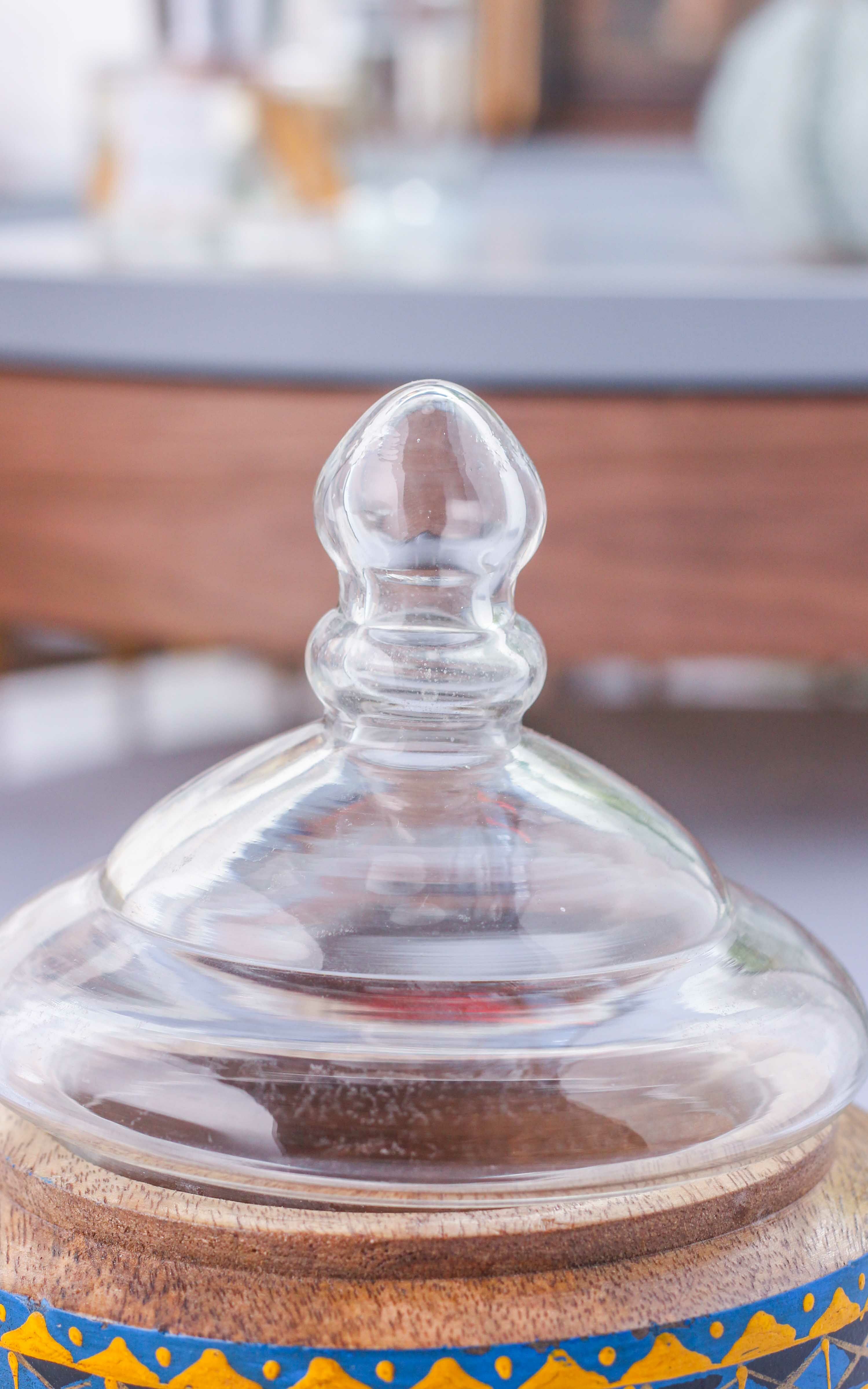 زيّن طاولة الضيافة الخاصة بك بتمرية موراليس - لون أزرق كبيرة أنيقة وعصرية مناسبة لتقديم الضيافة في المنازل والمكاتب بفضل تصميمها الفخم والأنيق. التمرية مصنوعة من الخشب العالي الجودة والمصقول بعناية ليكون سهل التنظيف ومقاوم للخدش عند الالتزام بتعليمات العناية بدقة ومزينة بزخارف شرقية ملونة بألوان زاهية تبعث البهجة. غطاء التمرية مصنوع من الزجاج الشفاف العالي الجودة والمحكم الإغلاق ليحافظ على التمور طازجة وصحية بمعزل عن الملوثات ويسهل فتح التمرية.