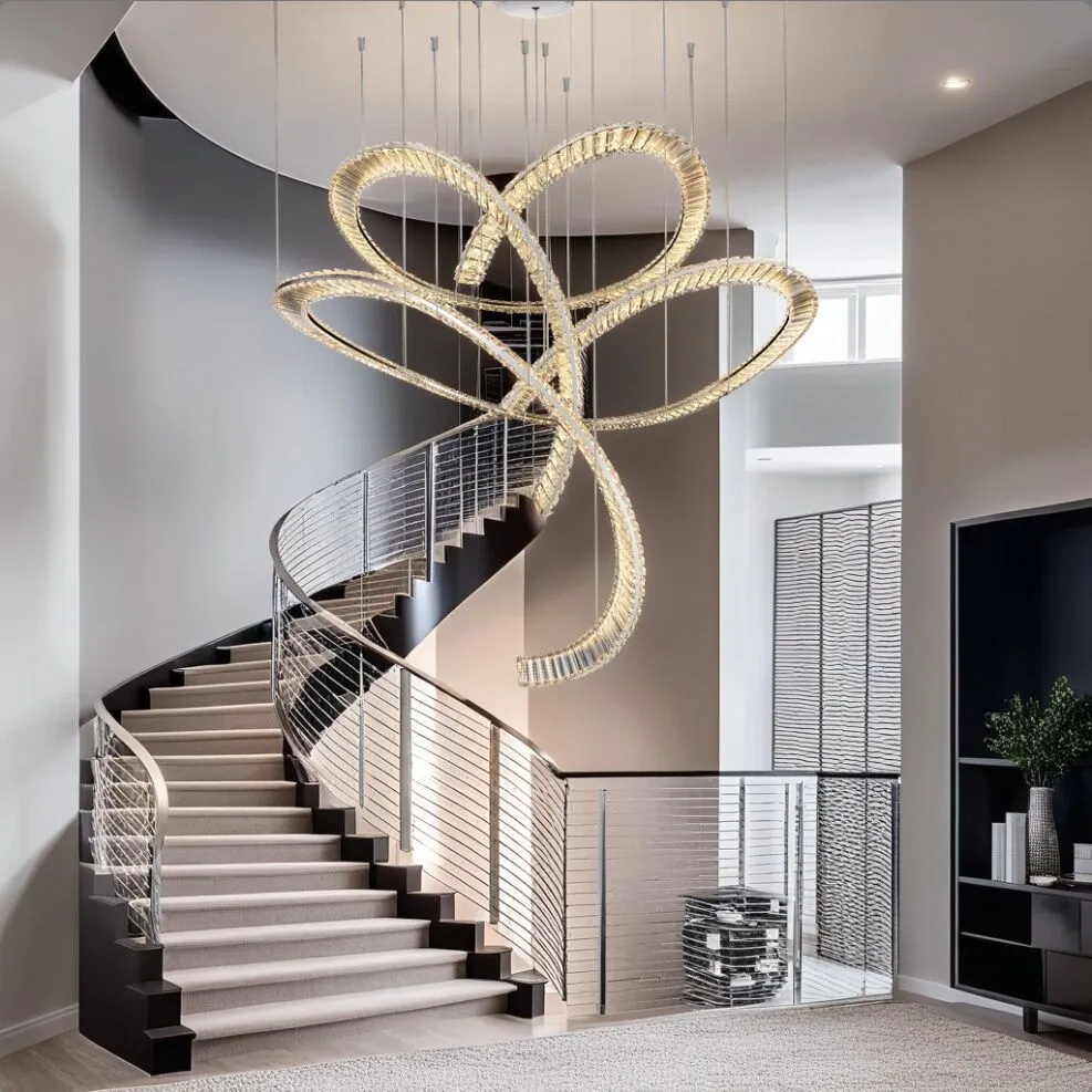 ثريا كريستالية فاخرة بتصميم عصري مميز تضيف لمسة من الفخامة والأناقة إلى المساحات الداخلية. مصنوعة من الفولاذ المقاوم للصدأ مع حلقات مرصعة بالكريستال اللامع، تتميز بإضاءة دافئة بدرجة حرارة 3000 كلفن بقدرة 120 واط وإضاءة تصل إلى 7080 لومن. يبلغ قطر الثريا 150 سم وارتفاعها 170 سم، مما يجعلها مثالية للمساحات الواسعة مثل الدرج أو بهو الفنادق. بفضل تصميمها الحديث والانعكاسات البراقة للإضاءة، تضفي هذه الثريا إحساساً بالفخامة العصرية مع الحفاظ على الطابع البسيط والراقي. مناسبة للاستخدام الداخلي فقط