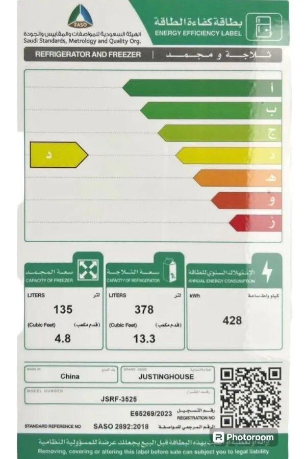 سعة الفريزر (ليتر): 135 لتر سعة الثلاجة (ليتر): 378 لتر |