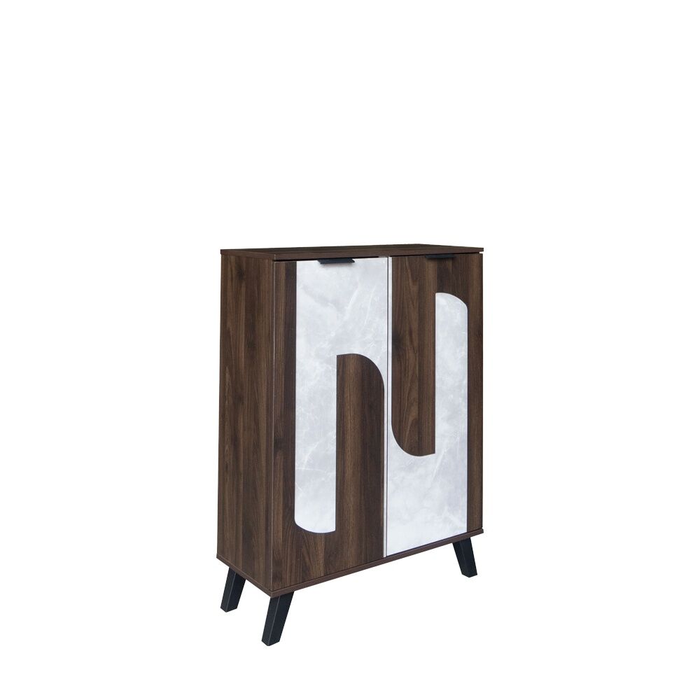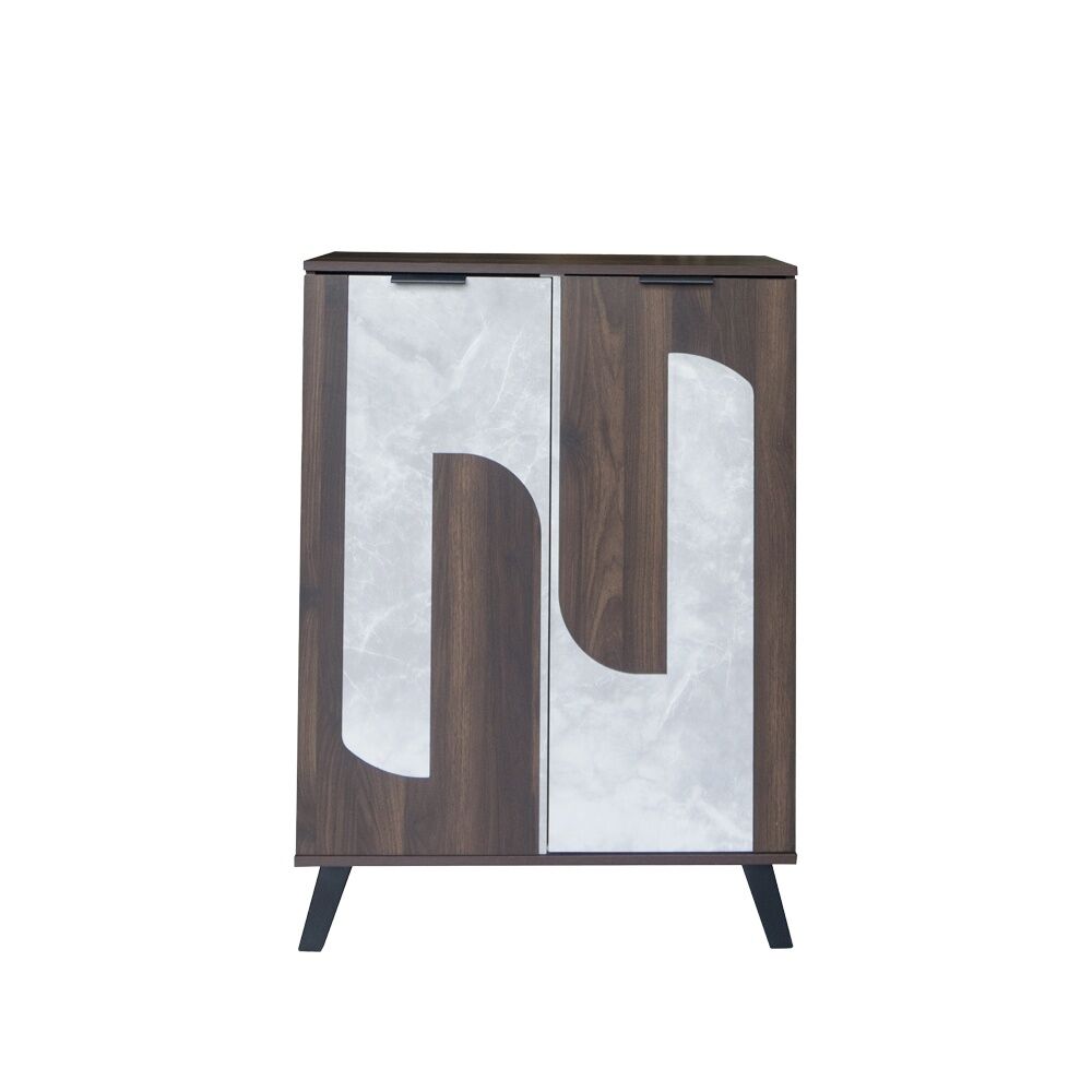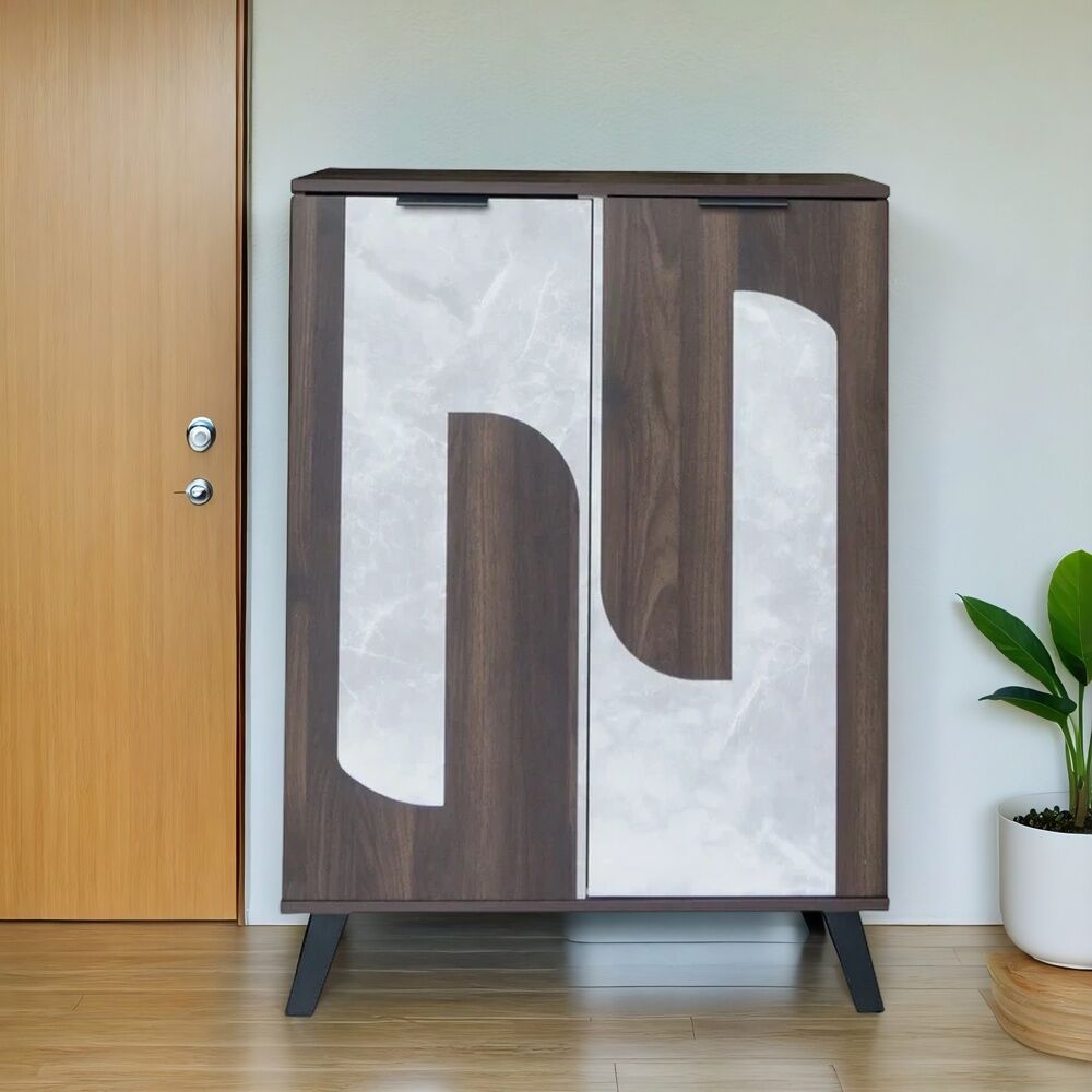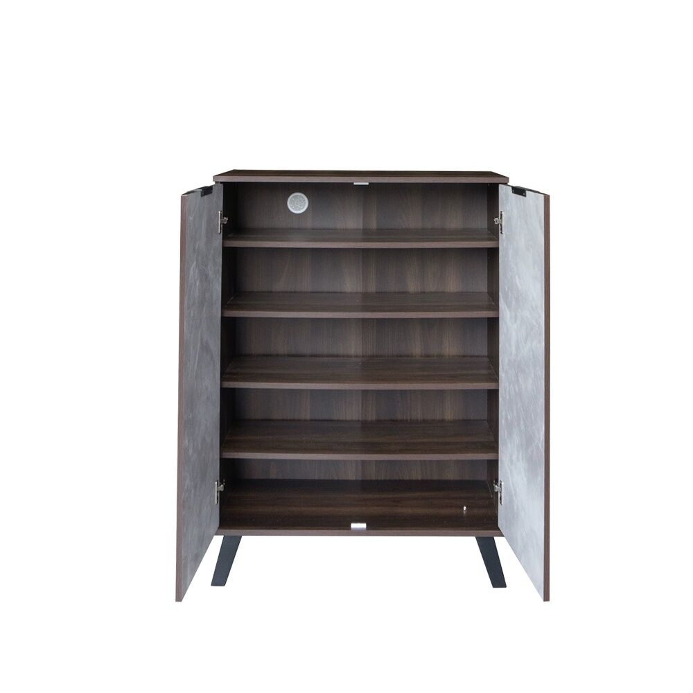 تحتوي خزانة الأحذية على عدة رفوف مغلقة بأبواب، مما يساعد في ترتيب الأحذية بشكل أنيق وسهل الوصول إليها.