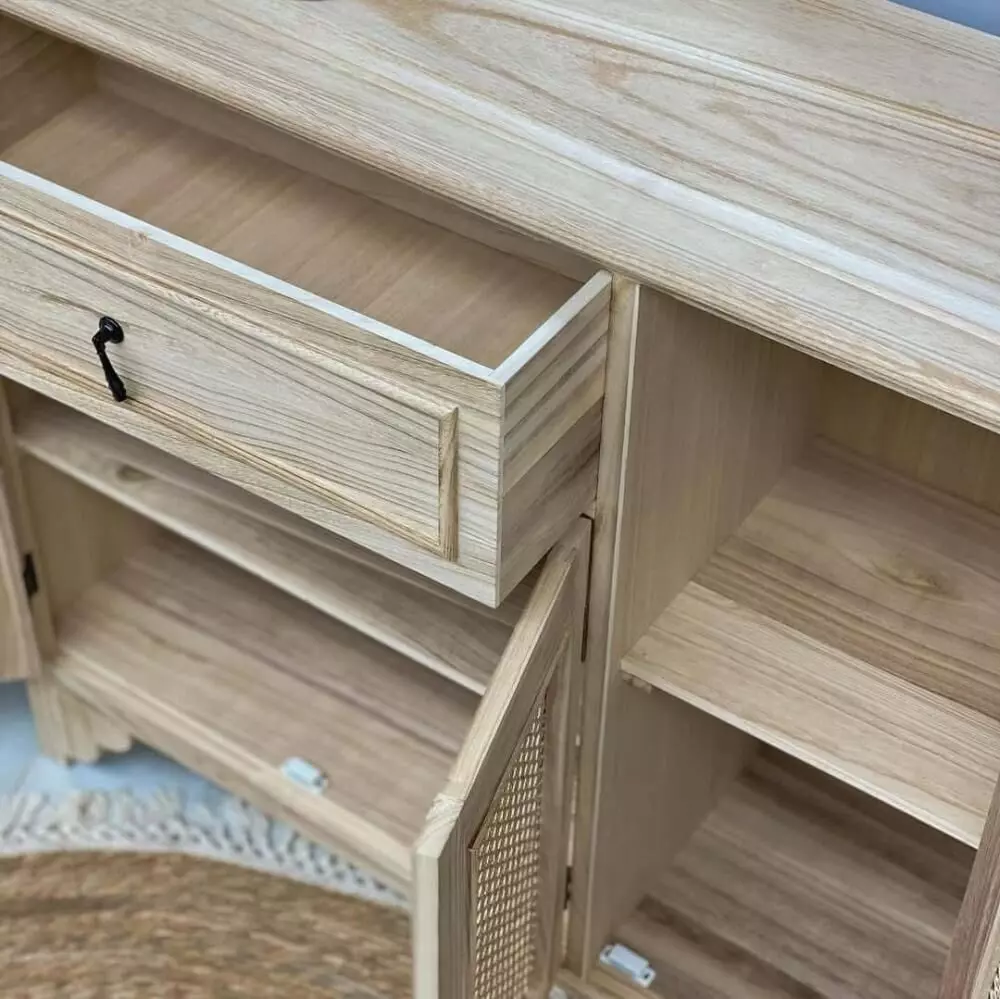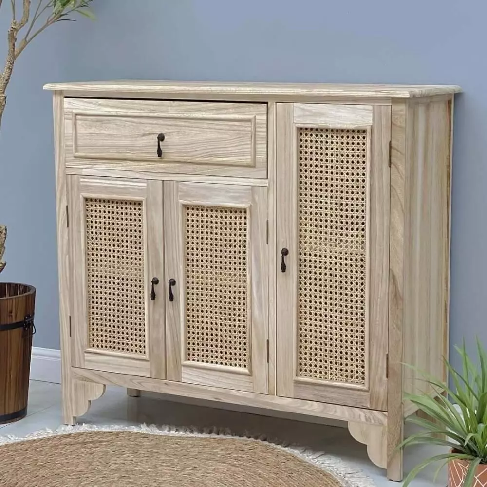 خزانة جانبية كندري : أنيق بتصميم يجمع بين الخشب والراتان ليمنح أي مساحة داخل المنزل طابعًا دافئًا وطبيعيًا مميزًا. يتميز بتوازن جميل بين العملية والجمال، حيث يوفر مساحة تخزين منظمة تساعد على ترتيب الأغراض اليومية بشكل مرتب وأنيق مع الحفاظ على مظهر ديكوري جذاب. يناسب المداخل وغرف المعيشة والزوايا الجانبية، كما ينسجم بسهولة مع مختلف أنماط الديكور سواء الريفي أو العصري، ليضيف إحساسًا بالهدوء والدفء ويعكس جمال التفاصيل الطبيعية في التصميم.