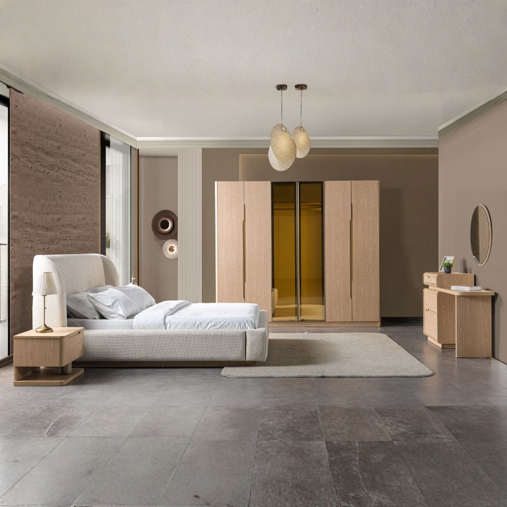 دولاب أنيق بتصميم عصري يجمع بين الخطوط المستقيمة والمظهر الراقي، يتميّز بلون بيج هادئ يضفي لمسة دفء وينسجم بسهولة مع مختلف أنماط غرف النوم. تتوسطه أبواب زجاجية تمنح إحساساً بالفخامة والاتساع، بينما تكمل الأبواب الجانبية المصمتة الشكل العام بتوازن وانسيابية. تصميمه المدروس يجعل منه قطعة تجمع بين الجمال والعملية في وقت واحد.