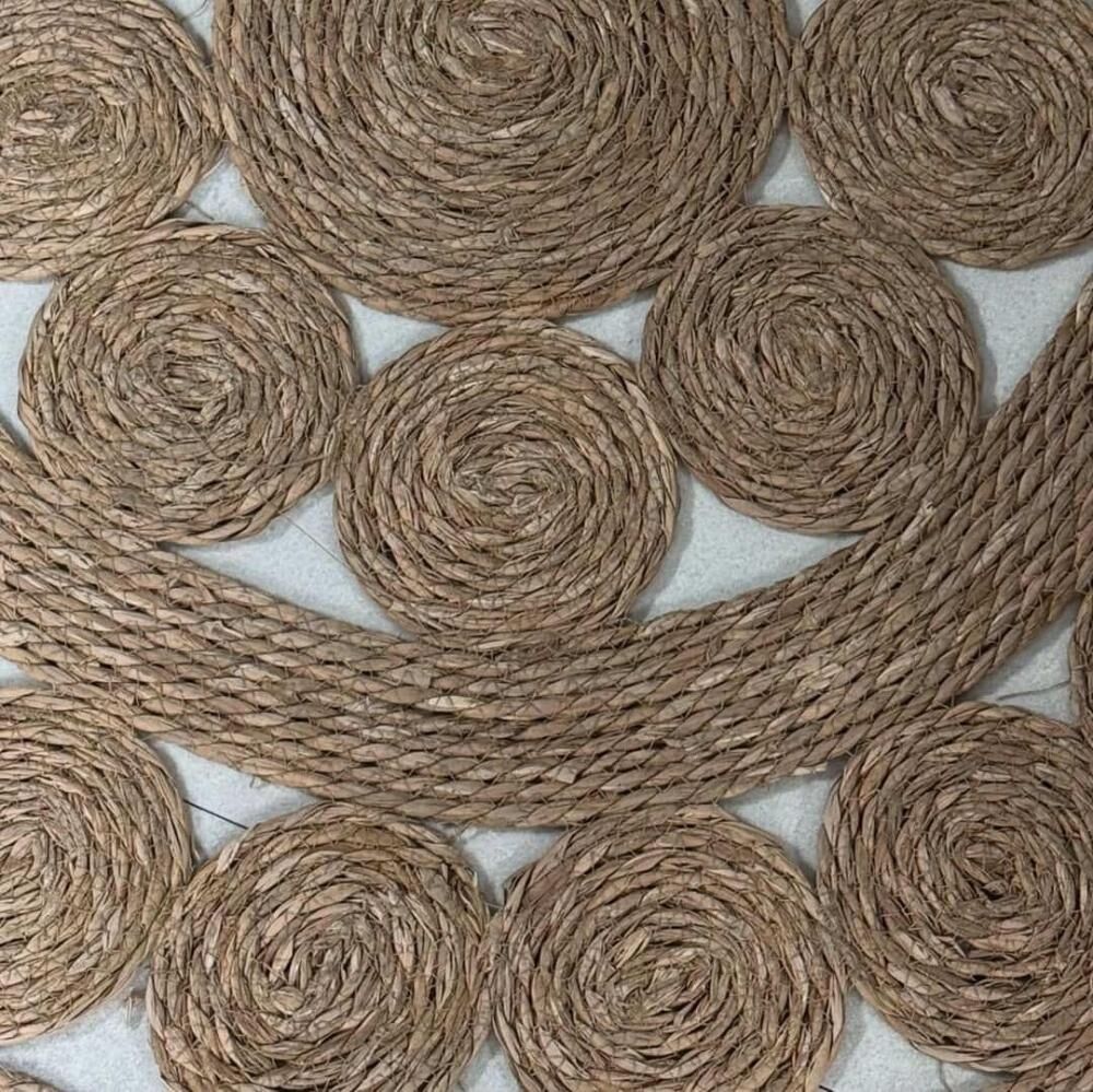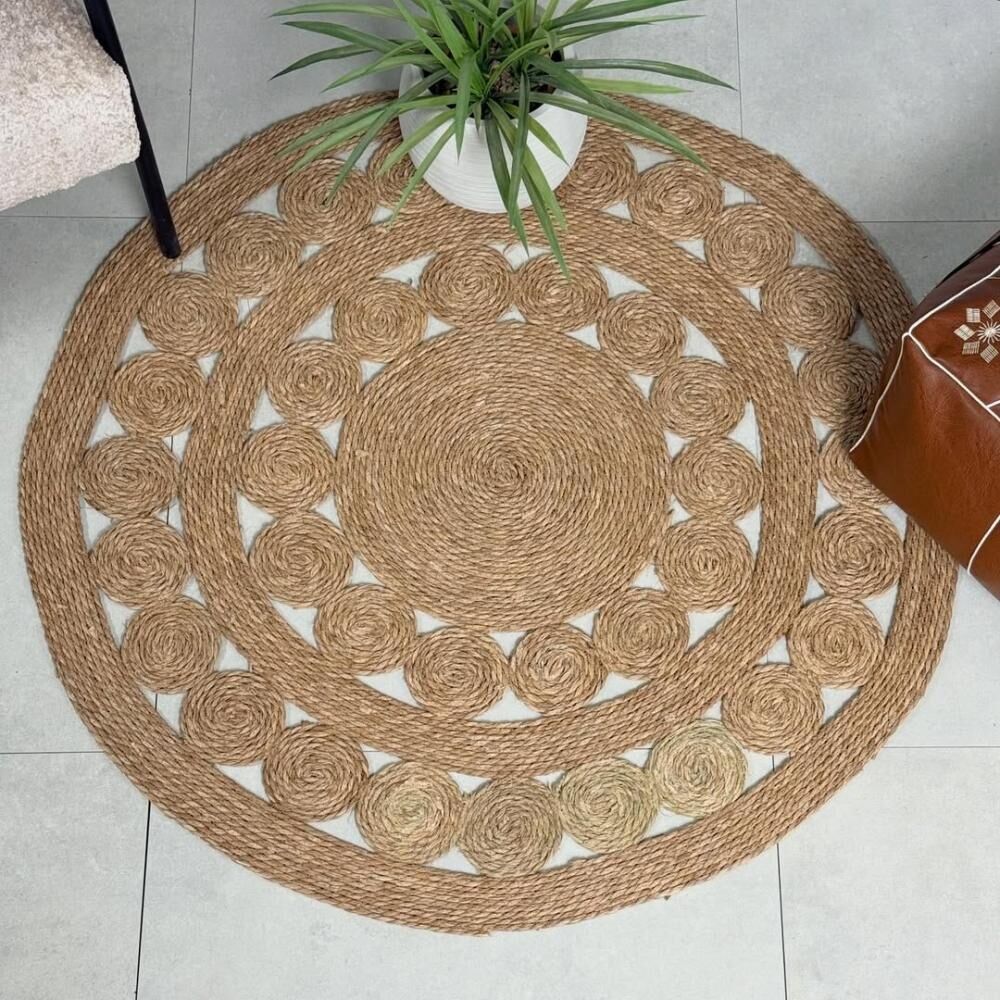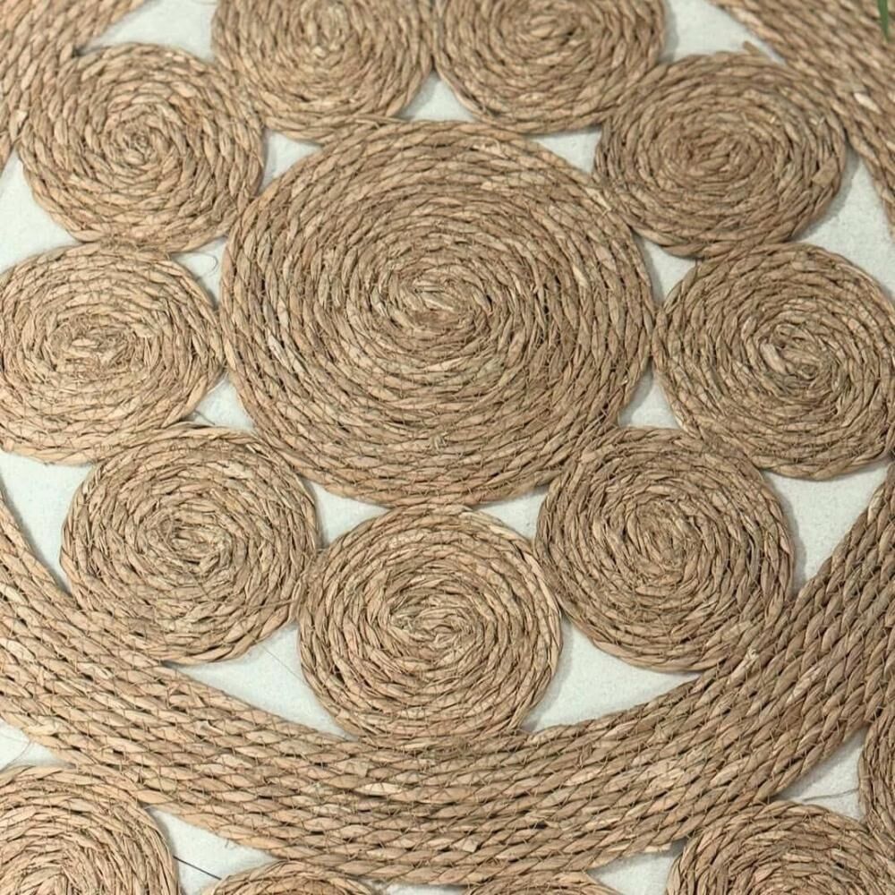 سجادة خوص بوهيمي الخامة قش طبيعي. مصنوع يدويا اختلفي بتفاصيل ديكورك الفاخر في منزلك بالحصول على هذه السجادة الفاخرة، مصممة بنمط المانديلا الساحر يضفي مزيدًا من الجاذبية عليها، تأتي بشكل مستدير، ومصنوعة من الجوت عالي الجودة، يدوية الصنع بشكل متقن، وتحتاج إلى التنظيف بالمكنسة الكهربائية لسهولة الصيانة.