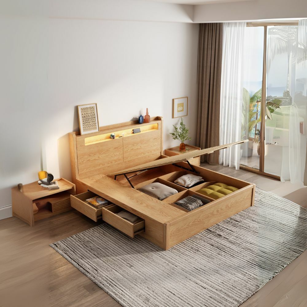 سرير كينج خشبي - بيج – تصميم ذكي مع أدراج ومساحة تخزين عملية