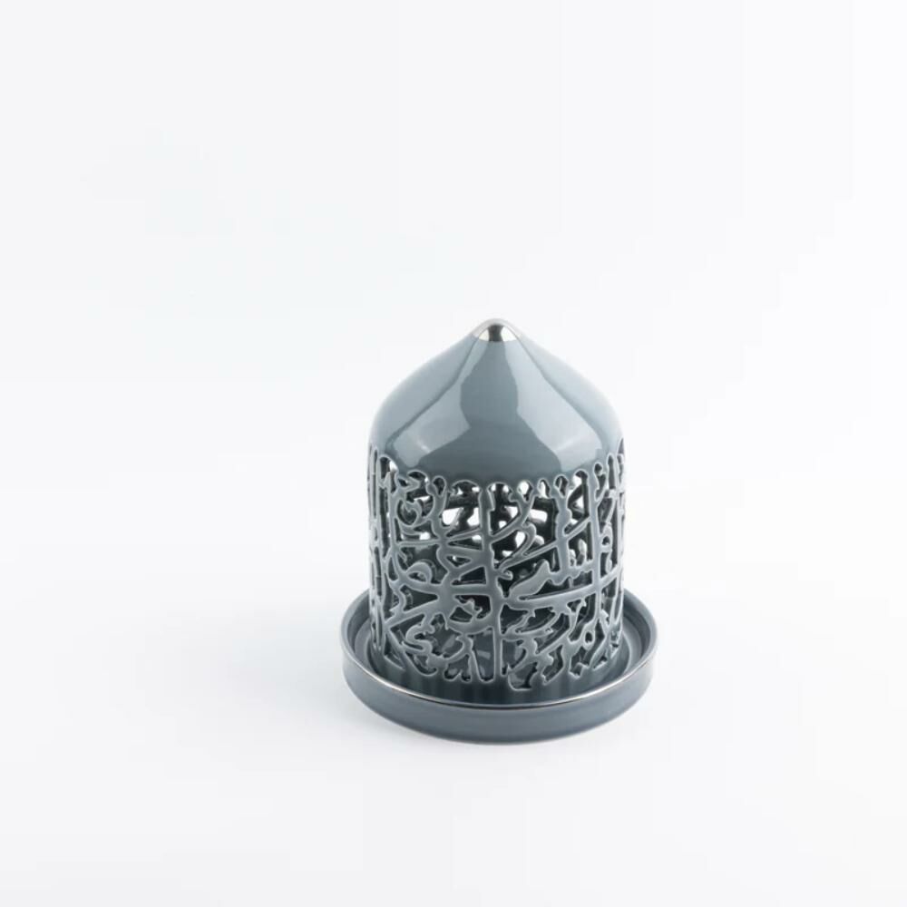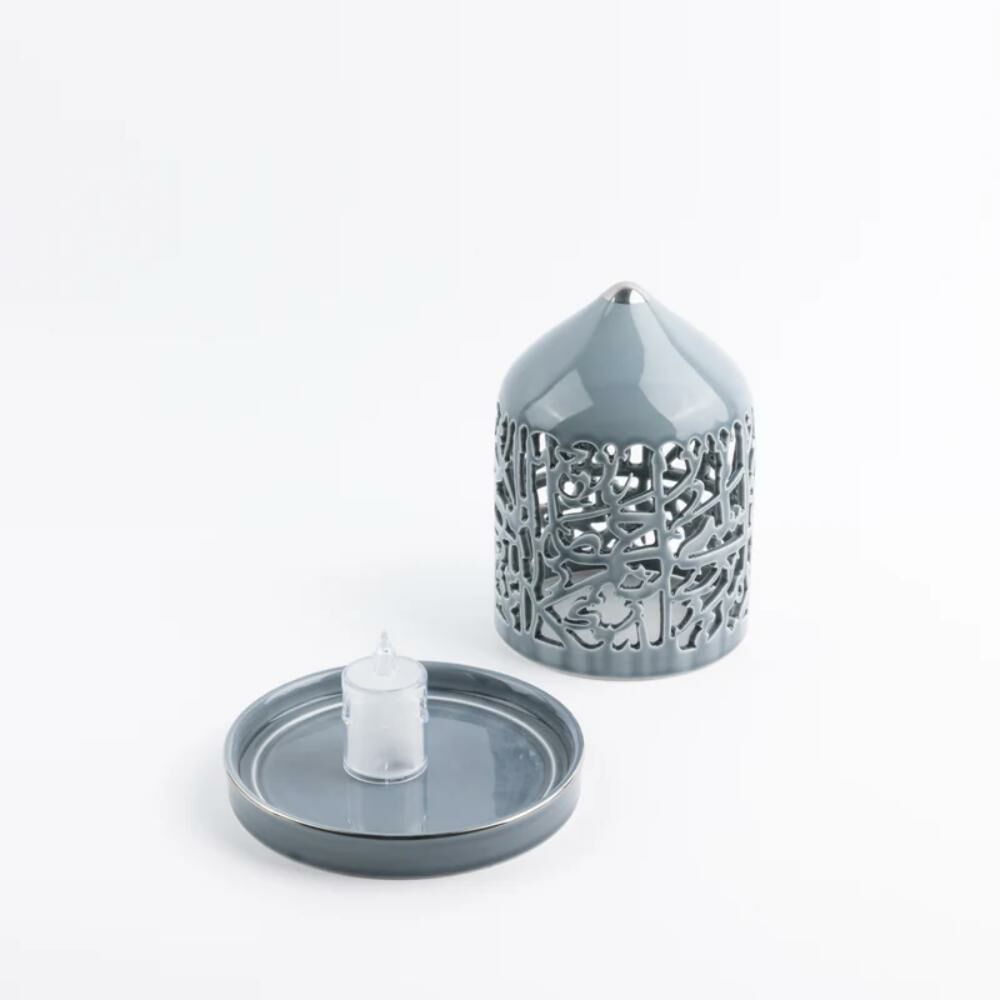 كما يتميز بغطاء مخروطي الشكل مع فتحة في أعلاه لتوزيع الضوء أو العطر تكتمل أناقة المنتج بقطعة إضاءة صغيرة الحجم توضع داخل الشمعدان.