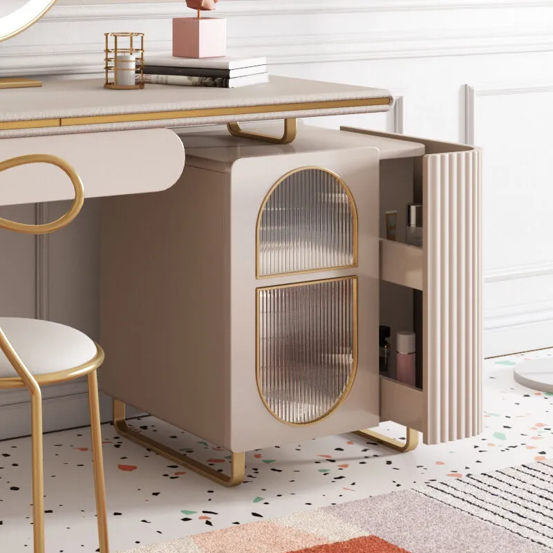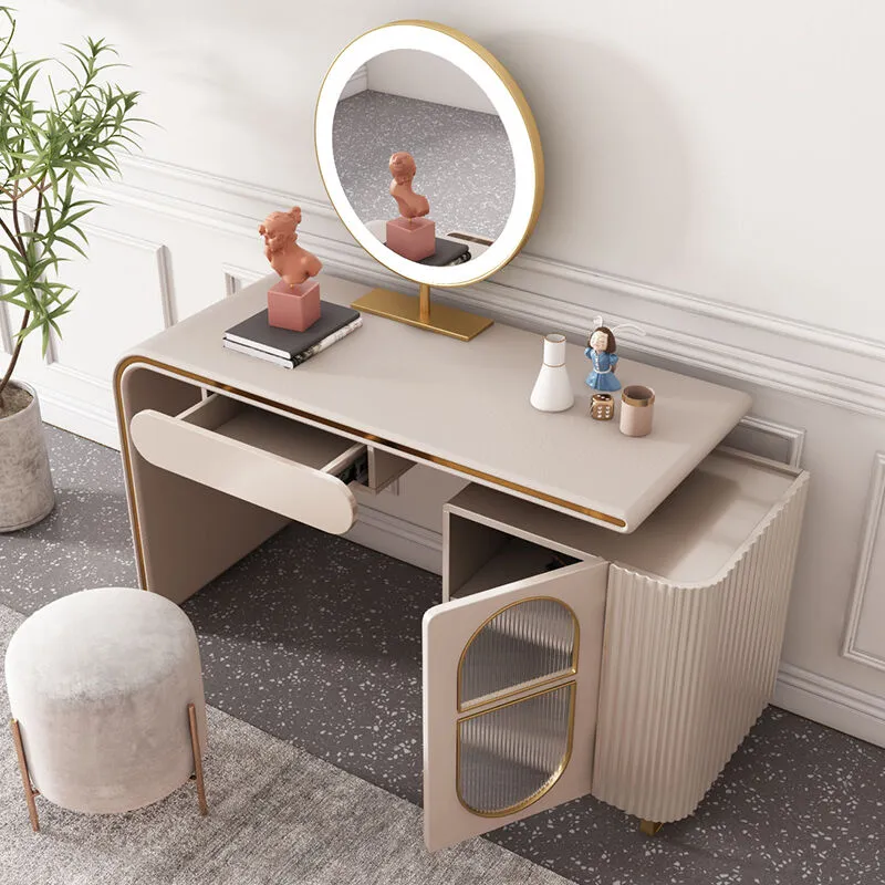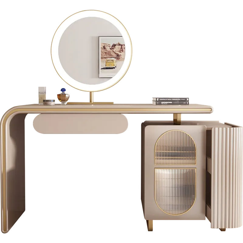 افضل طاولة تزيين تسريحه غرفه امانتي ناعمة والتي تم تصميمها لتناسب غرف النوم من خلال اللون بيج الفاتح الجميل المتوافق مع كافة الأذواق والاثاث وكذلك تناسق الشكل حيث ستجد الطاولة مع مرأة جميلة دائرية الشكل ، إضافة إلى مساحة تخزينية خزانة جانبية كونسول متناسقة مع الطاولة لتخزين منتجاتك العناية بالبشرة والمكياج وكل المستلزمات الخاصة بك بشكل منظم