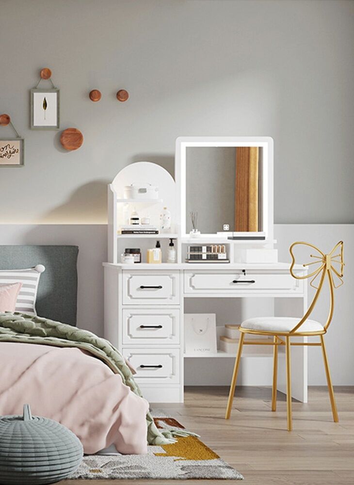 مرآة LED: تأتي طاولة التزيين مزودة بمرآة LED مدمجة، توفر إضاءة كافية لتطبيق المكياج أو تصفيف الشعر.