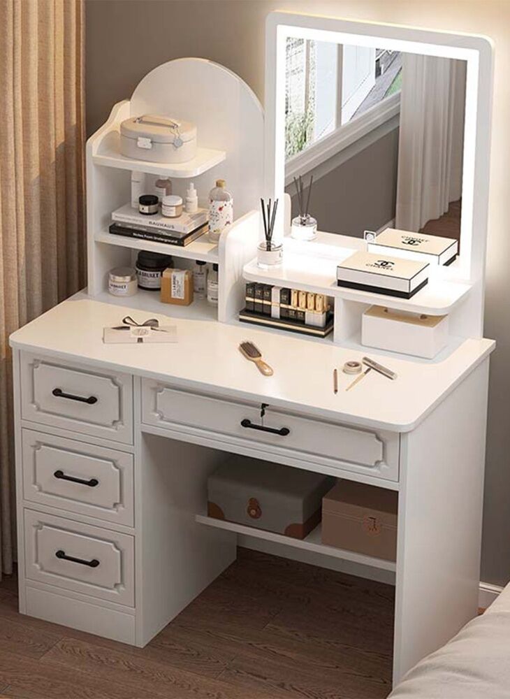 تخزين وفير: تحتوي على عدة أدراج وأماكن تخزين توفر مساحة واسعة لتنظيم المكياج، ومنتجات العناية بالبشرة، والإكسسوارات، وغيرها من الضروريات، مما يساعد في الحفاظ على منطقة التزيين خالية من الفوضى ومنظمة.