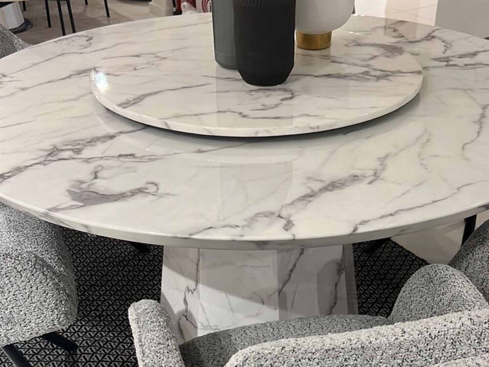 طاولة طعام مارلي بالكامل مصنوعة من رخام صناعي عالي الجودة يضمن الفخامة والمتانة في كل جزء من الطاولة.