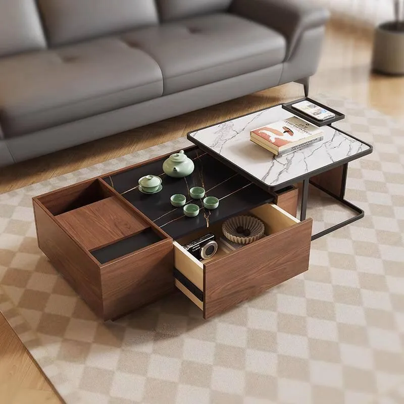 طاولة قهوة و طاولة جانبية مارغريت خشبية و سطح رخامي - بني