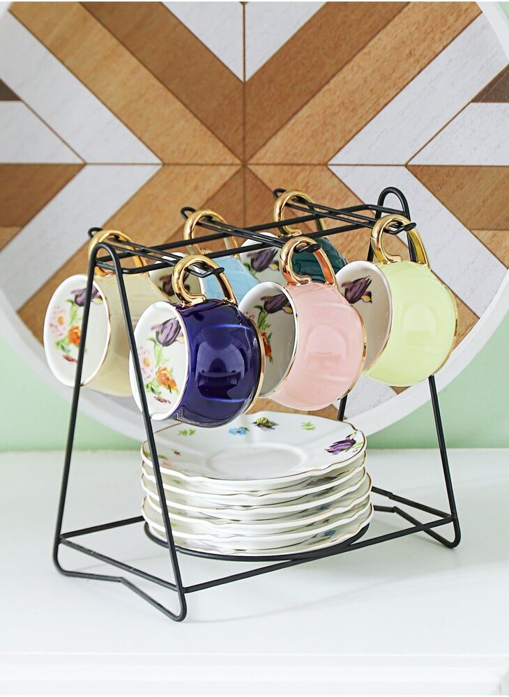 كوب وصحن صغير بخمسة أوراق مع مقبض ذهبي طقم 6 أكواب وأطباق سيراميك مع إطار حديدي